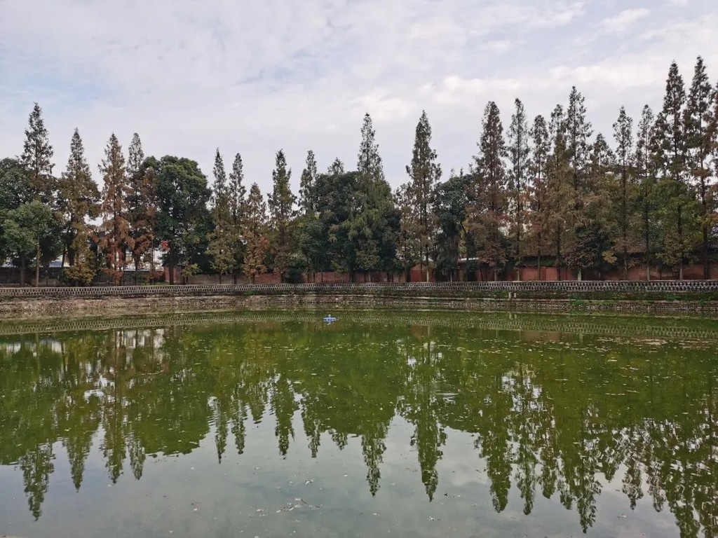 从古汉台穿过一片老旧街区,街道上大都是“周易研究中心”和古旧的书店,颇有神秘氛围,神秘街道尽头一池不起眼的湖水,就是古饮马池了。