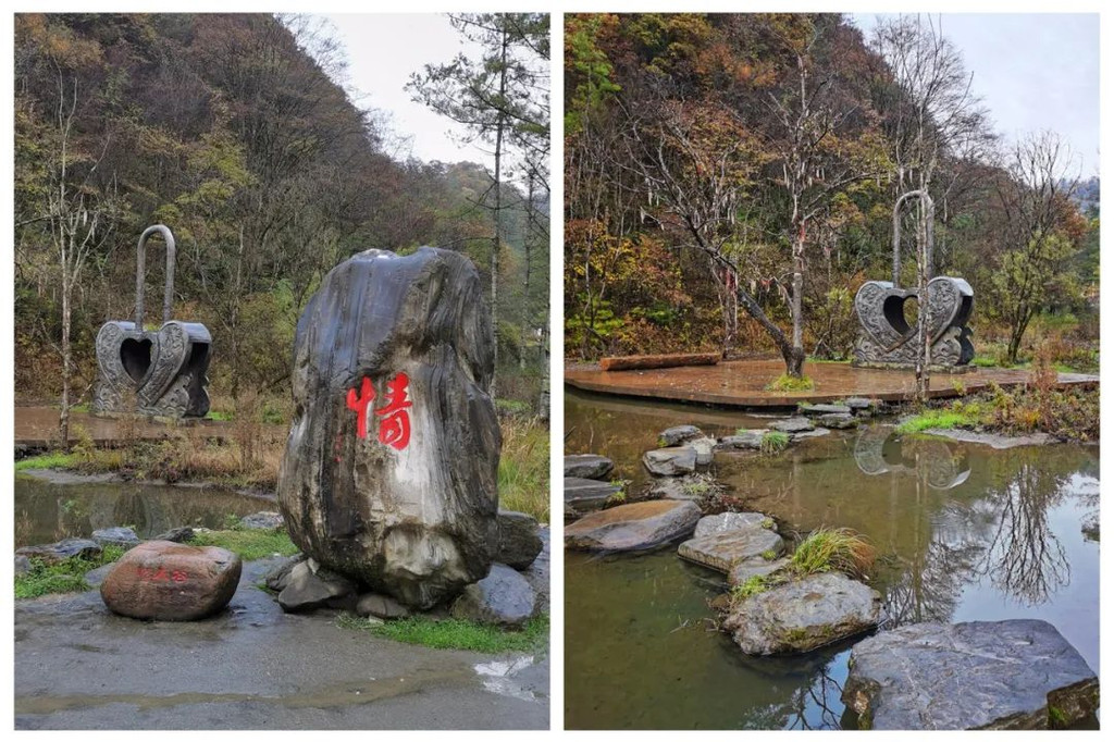 从张良庙西行十公里,经九叠泉,穿过一座隧道,可达情人谷。一路上景色美滴“撩咋咧”,只是有些路段下雨泥泞难行,车身上溅了一层泥,不过瑕不掩瑜。
