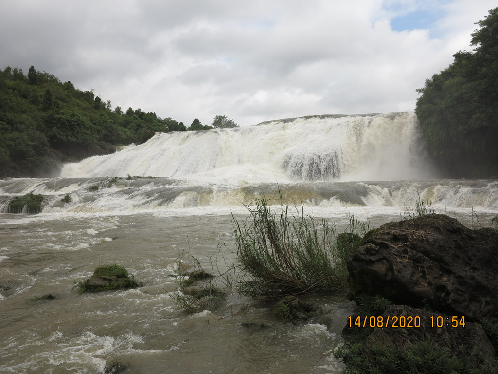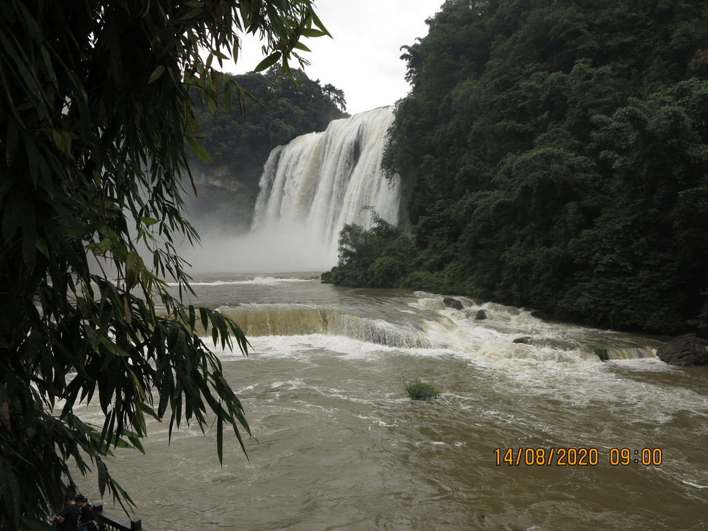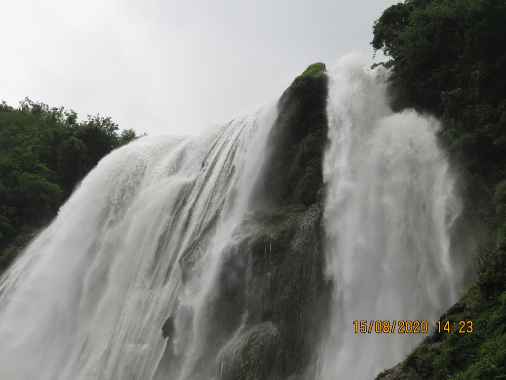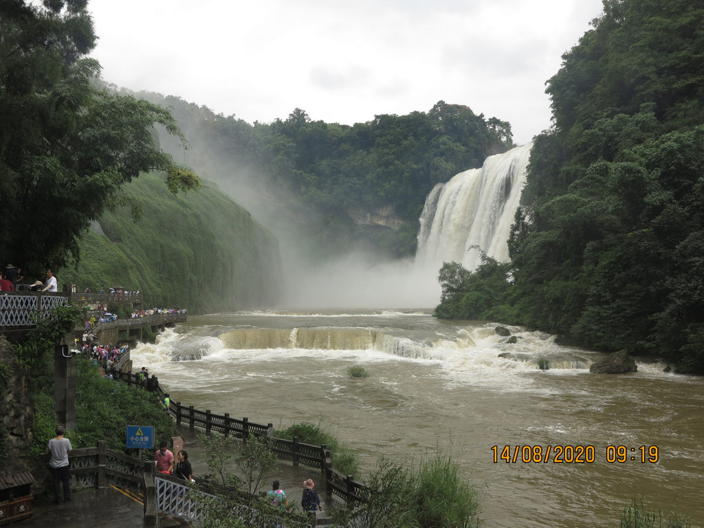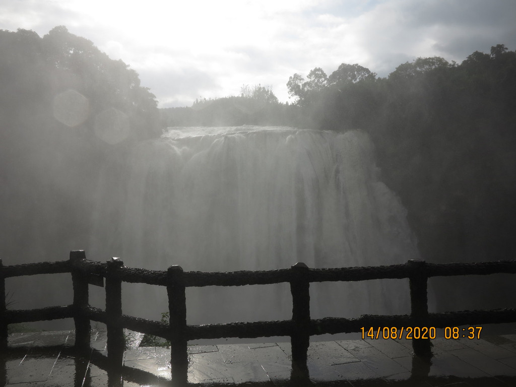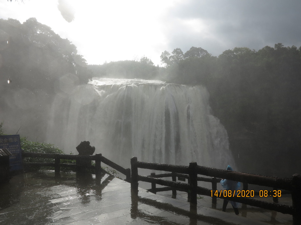 酒店早餐一般般,但餐厅下有个门直通黄果树景区,方便。十年前来过黄果树,冬季水小,这次水流巨大。一路步行来到观瀑台,非常震撼,由于塌方,瀑布后的水帘洞去不了。沿着步道上下左右多看看大瀑布,没有雨,但有彩虹,全身湿透。