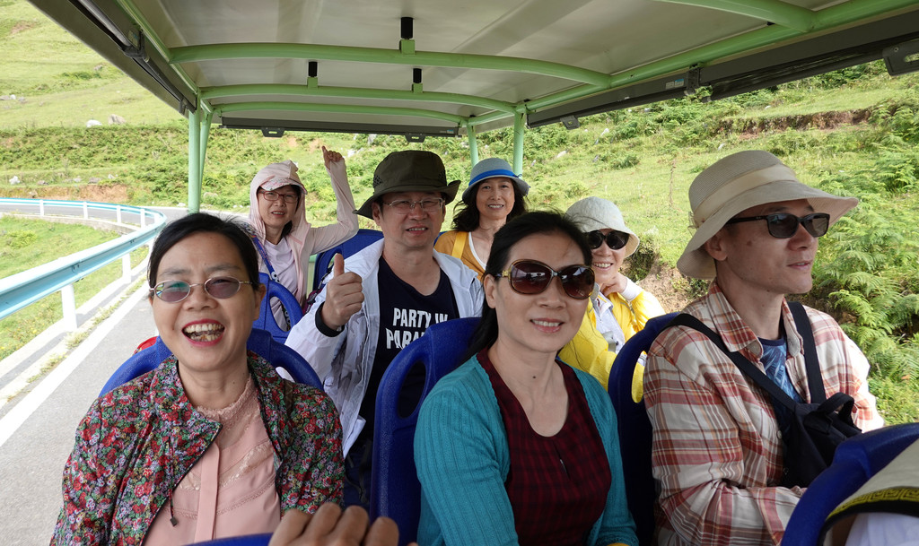观光车的终点距离山顶还有一段路,要爬一个坡,才到山顶。