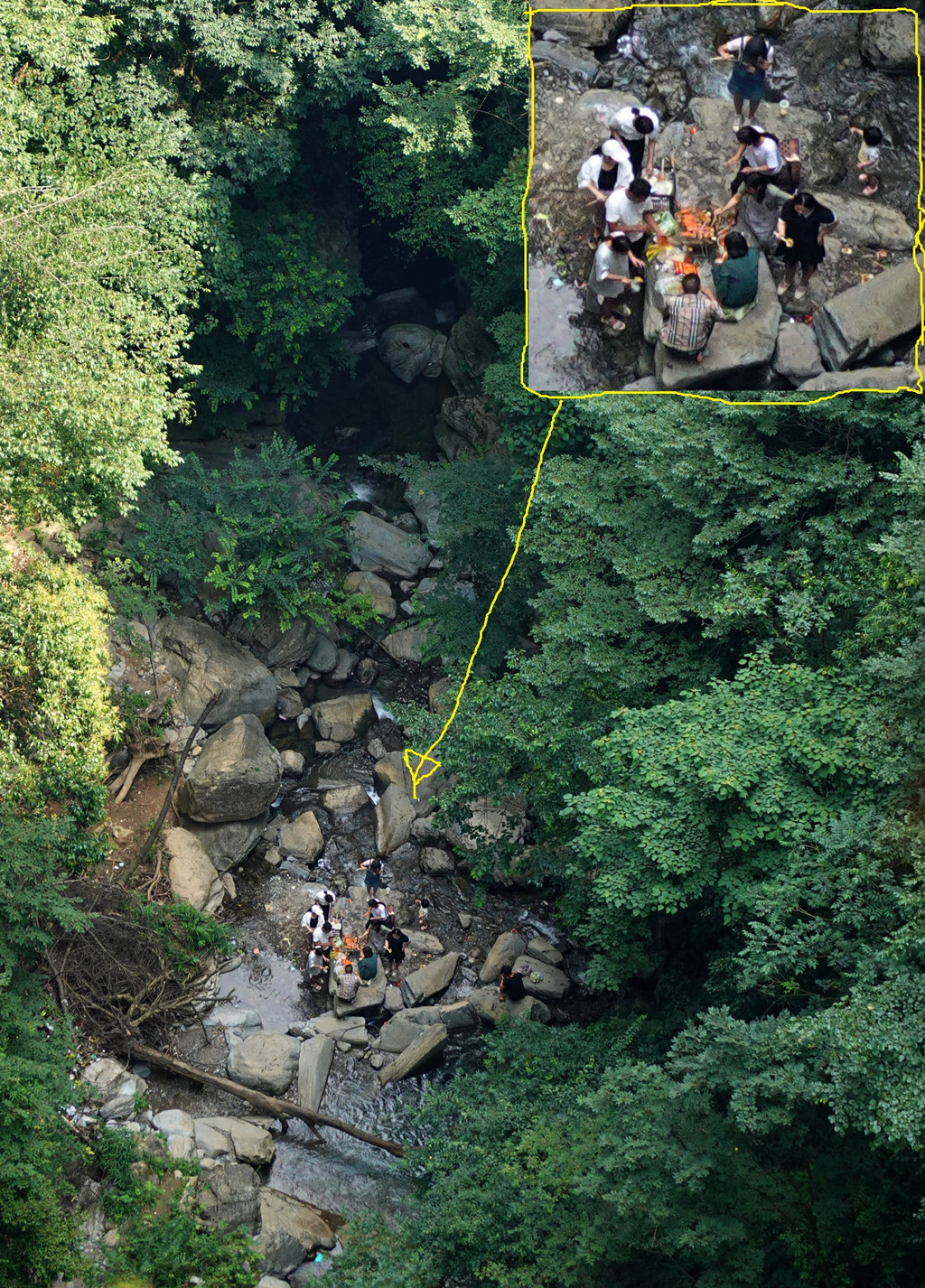 P92. 有一群年轻人在天生桥下的小溪旁烧烤。