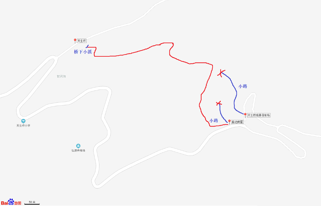 P87. 吃粉的时候,老板娘的弟弟告诉我们:天生桥在天生桥小学旁的小路里面,走80米就到了,有栏杆哟!(可是我一踩油门,冲了800米。记错了。)