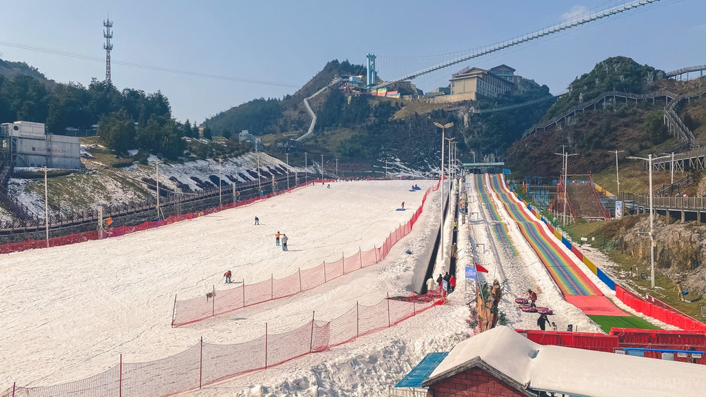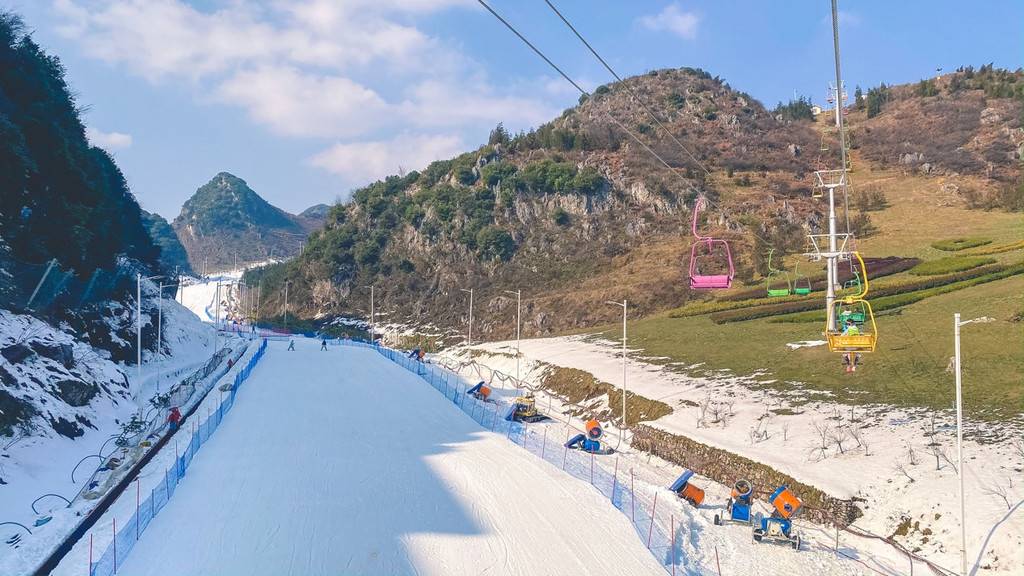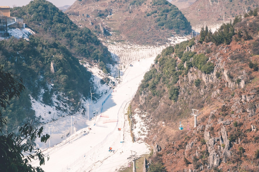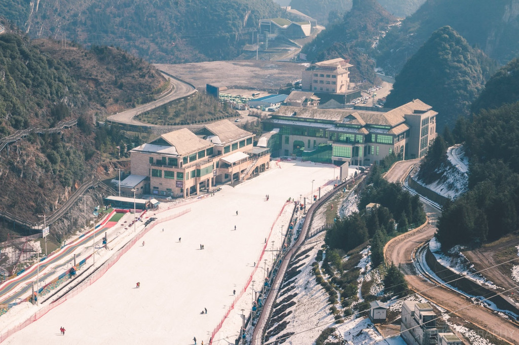 黄果树.奇遇岭坐落于贵州省安顺市关岭县永宁镇,距离黄果树景区20公里,景区内有一个室内滑雪场,据说是目前中国西南地区最大的室内滑雪场,总面积1.5万平方米,可同时容纳800人滑雪,一年四季都开放。