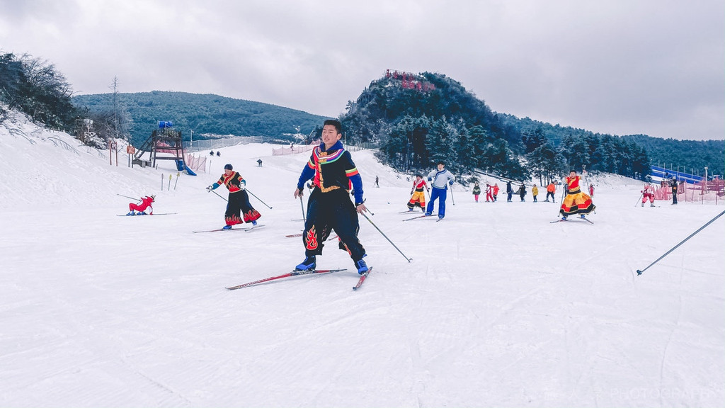 穿着少数民族服装的少男少女,在雪中滑雪的场景诠释着独特的风格!
