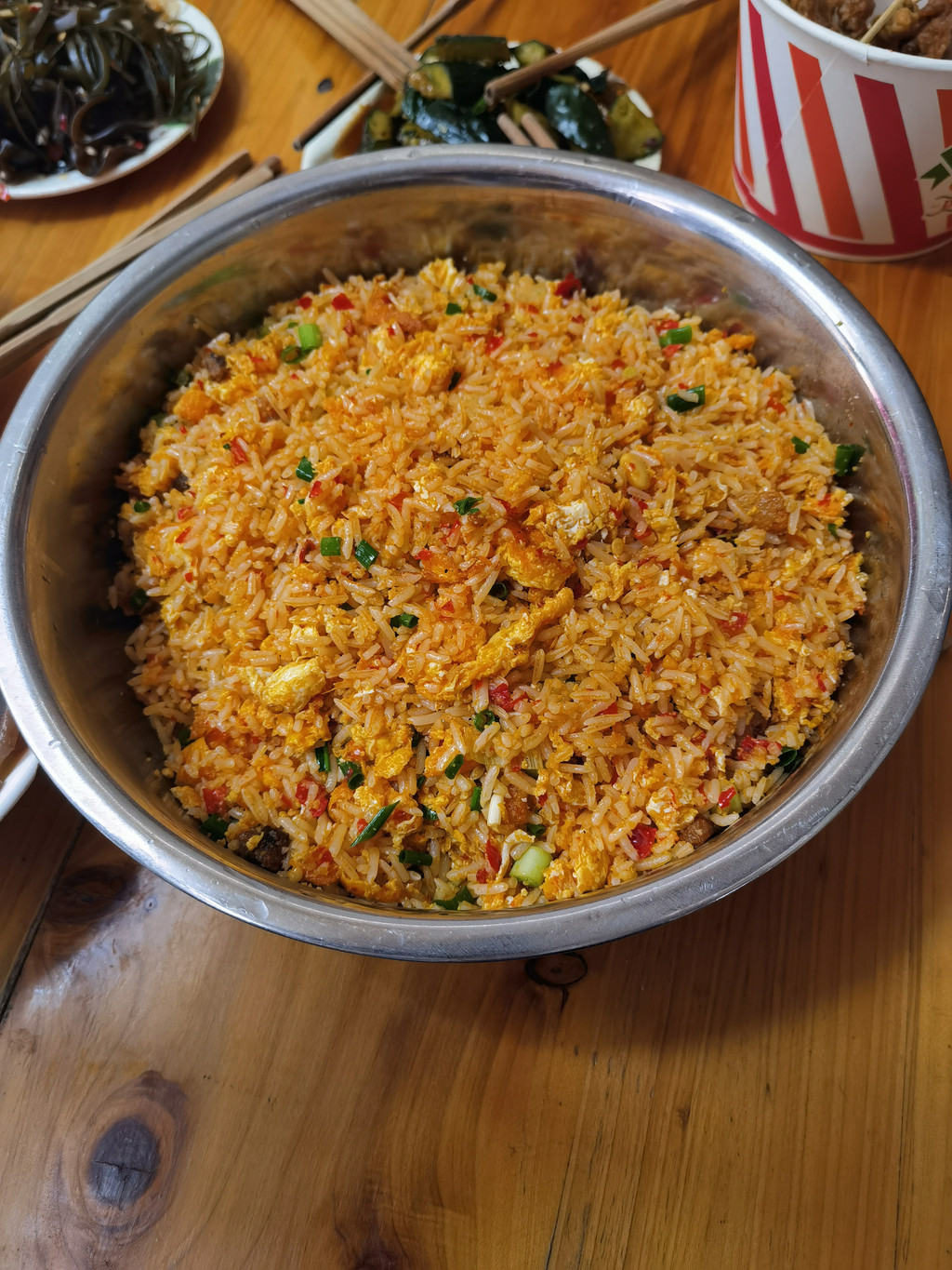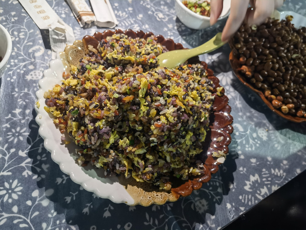 从万峰林出来,路过将军桥,来到了将军峰黄秀蛋炒饭,一家网红的蛋炒饭,据说上过《舌尖上的中国》和《国家地理杂志》,周边十来家店都卖蛋炒饭,五一节一天蛋炒饭收入加起来超过20万元。排队一个小时,终于吃上了。