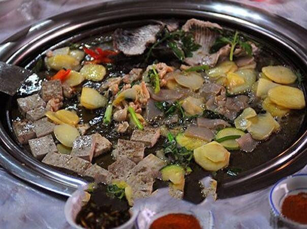 水城烙锅。水城烙锅历经300多年发展以后,烙锅的工具已经由当初的凹状瓦片或瓷器土坛片发展成为现在的这种中间凸起的黑砂烙锅,独特的工具可以让多余的油脂自动流向两边收集起来,随时可以浇淋在食物上。水城烙锅,相传已经有300多年的历史,有人曾经说过,“来水城没有吃上一顿烙锅,等于你白来一趟”。 而且,现在的水城烙锅“无所不烙”,各种荤素食材都有,配上口感劲爆的辣椒蘸料,香辣爽口,味道奇香。据说,有不少人都不是为了吃食材,而是冲着吃蘸酱来的。