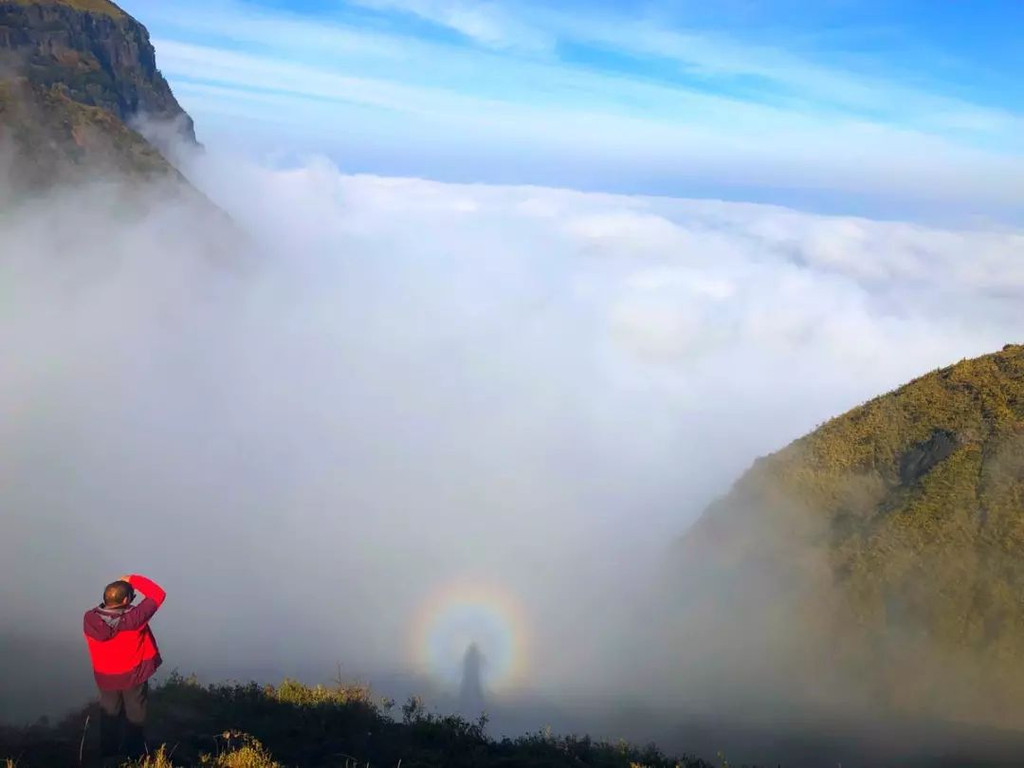 乌蒙山特殊的气候和地理环境还使这里产生了一个更奇特的现象,那就是神秘的佛光,佛光是特殊气候和地理环境下形成的光学现象,天气骤变而造成较大水汽时,光线遇到这些水汽产生折射,才会形成佛光。在我国只有峨眉山、梵净山等少数地方有,而这里春夏秋三个季节都会出现,一般都在下午,出现时间均在4点至6点左右。观看“乌蒙佛光”已成为慕名到盘县观光旅游游客的首选。