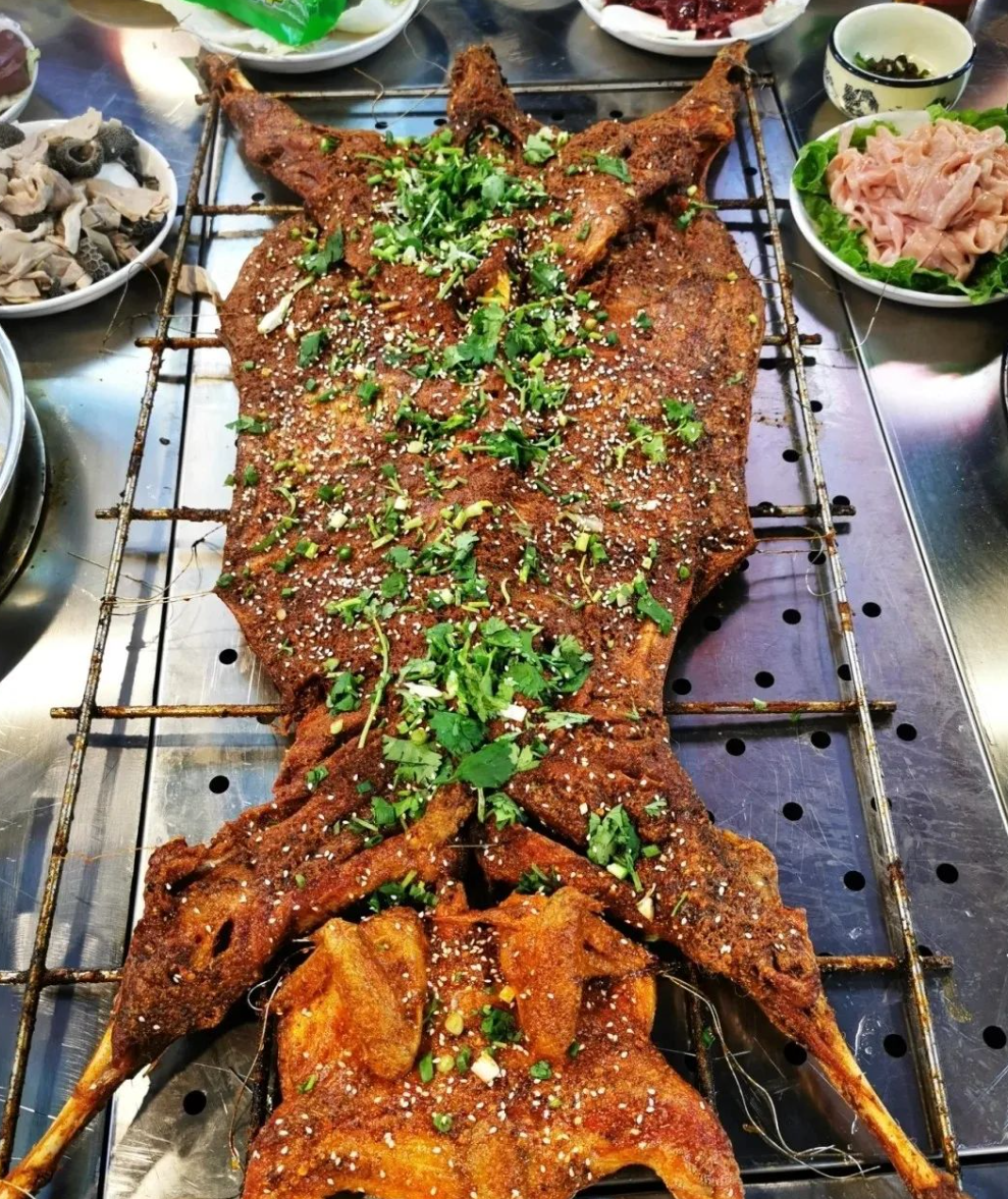 外部金黄油亮,焦黄发脆,内部肉绵软鲜嫩,羊肉味清香扑鼻,颇为适口,风味别具一格。