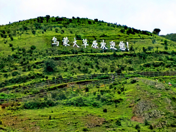 车子在景区中行驶了一段路后,只见映入人们眼帘的是在草原山脊上矗立着许多高大的白色大风车。在快到山顶途中的山坡上,有着“乌蒙大草原欢迎您”的八个白色大字赫然醒目。