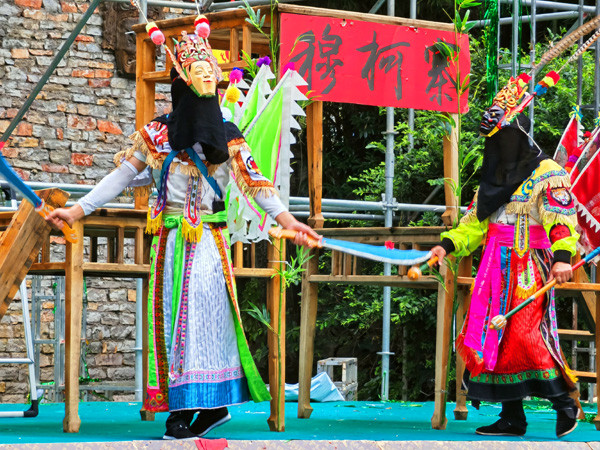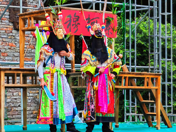 表演时,演员们额上戴木雕面具,身着长衫,背插小旗,腰系战裙,手持木制短刀长枪,唱着原始的弋阳腔,表演《封神》《楚汉相争》《三国》《薛刚反唐》《精忠传》等中国古代忠义历史故事和神话传说,被称为戏剧史上的“活化石”。