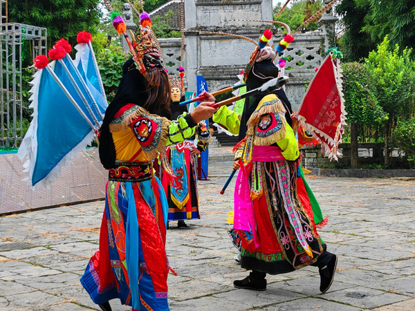 陈燕介绍说,屯堡地戏是当地的一大特色,它由原始傩舞的分支军傩演变而来,是集演戏、祭祀、娱乐于一体的古老戏种。屯堡文化中,地戏是一种重要的表现形式,主要演绎古代战争题材,通过这种方式,屯堡人传承和弘扬了明朝的文化和历史。