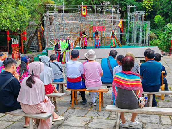 景区导游陈燕说,由于景区中每天的“地戏”表演是有时间段的,故此先带大家去演出现场观剧。之后,再进行古镇的观光游。于是,大家在她的带领下穿街走巷,来到了古镇中的地戏表演现场演武堂。这里曾经是屯堡士兵操练和表演地戏的地方。如今在这里可以欣赏到精彩的地戏表演,感受古老戏曲的魅力。