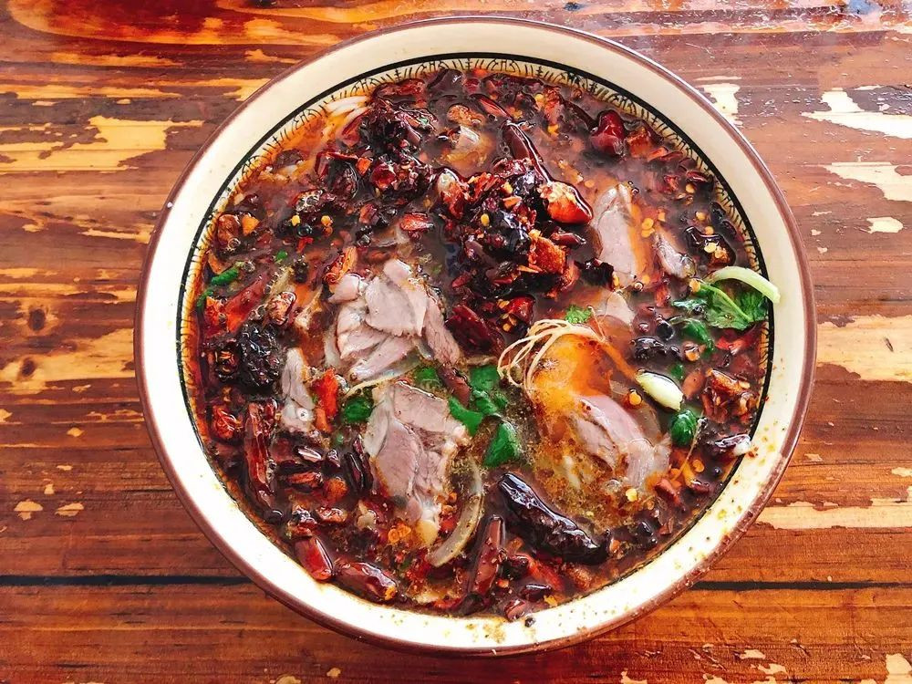 水城羊肉粉选用当地放养的黑色矮脚羊,肉质紧致、入口弹牙,粉用的是细粉,油辣子香而不辣。端上桌汤汁浓郁,嫩白的米粉上盖着大块羊肉,香菜点缀,记得一定要拍几瓣蒜放进热汤里,一口粉、一口蒜,吃得大汗淋漓,过瘾十足。