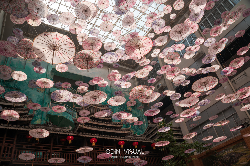 步入展馆一楼大厅就看到尽是粉色的纸伞,满满的中国风。