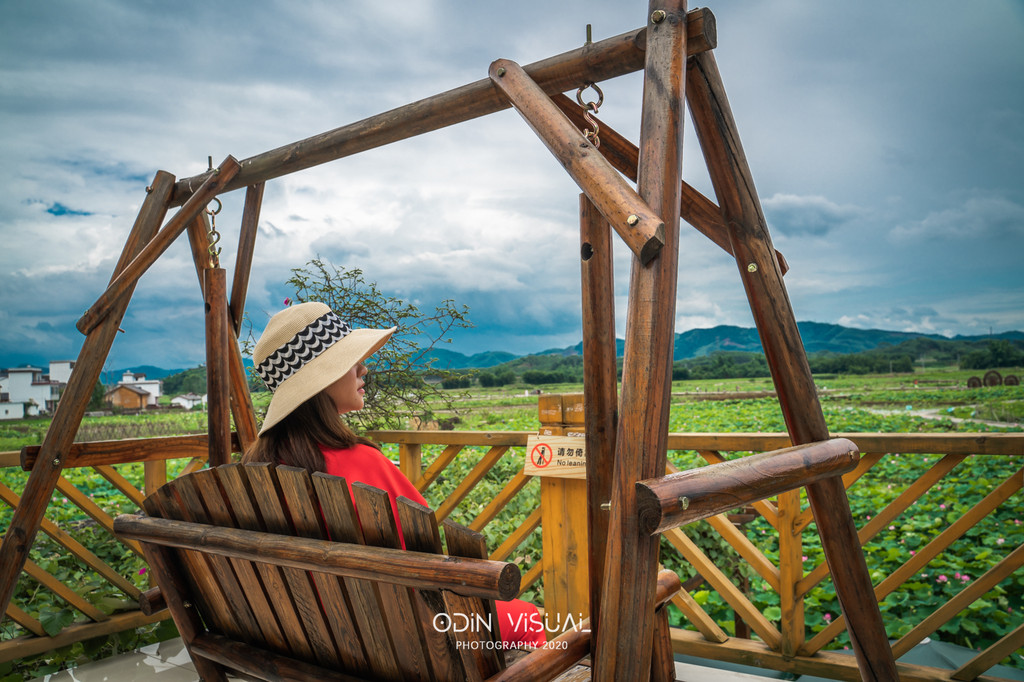 2楼有个摇椅,是个景色俱佳的观景台。这一片荷花池吸引了不少游客,偶尔还能看到旅游大巴车,来来往往的人,络绎不绝,热闹非凡。