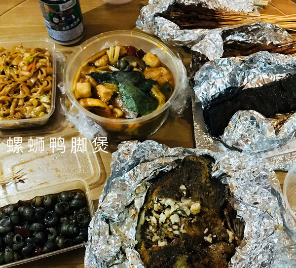 这是我们叫到酒店的外卖宵夜,以烧烤为主的出品水准超高,就有鸭脚螺蛳煲、炒嗦螺,还有烤鱼、烤羊肉串、烤臭豆腐、烤掌中宝、竹签牛肉...再配上漓泉啤酒,幸福感满满。↓