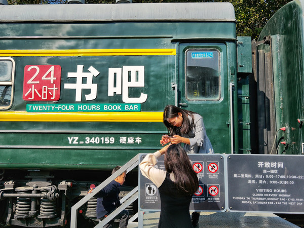 网红24小时书吧,由几节柳州自己制造的也曾经使用过的火车车厢改造而成,由于疫情的原因并没有开放,但阻挡不住成群结队的妹子赶来拍照留影。↓