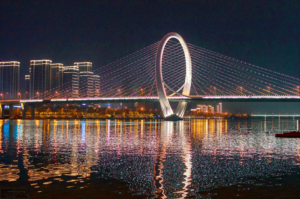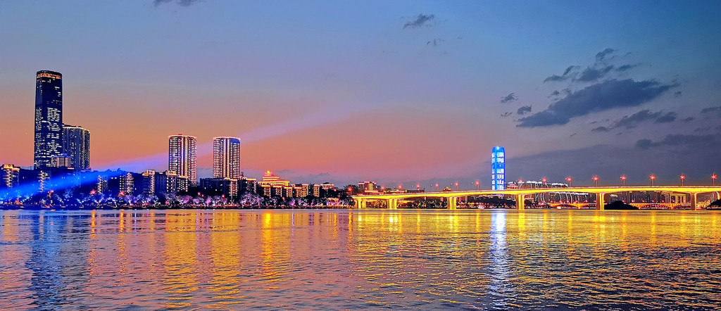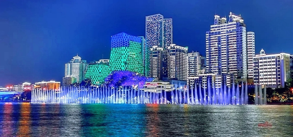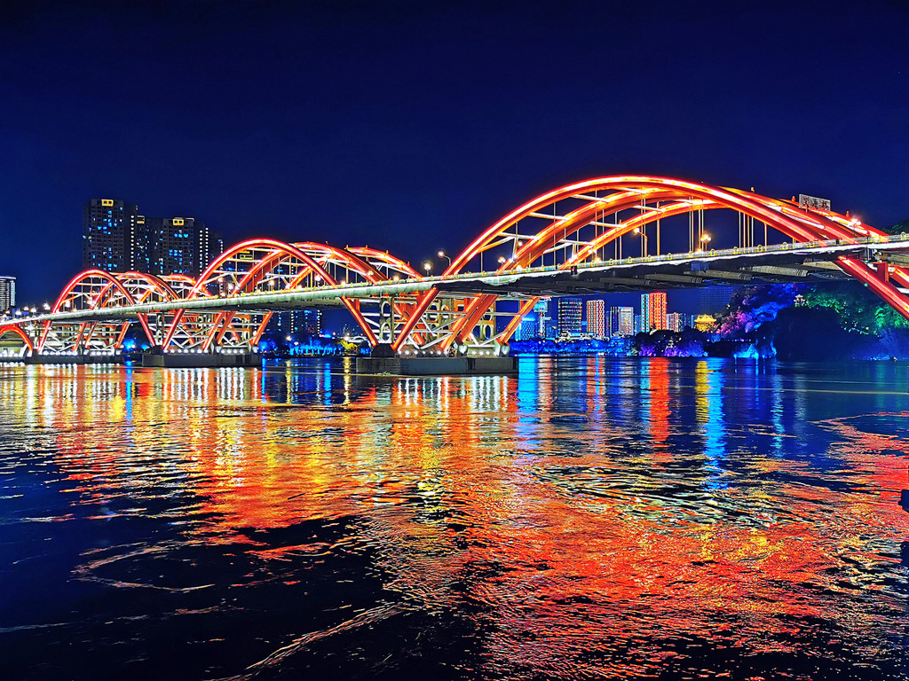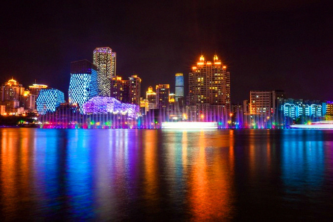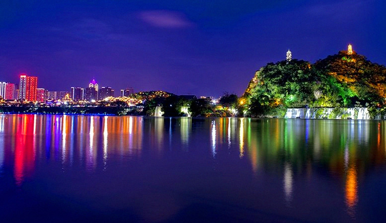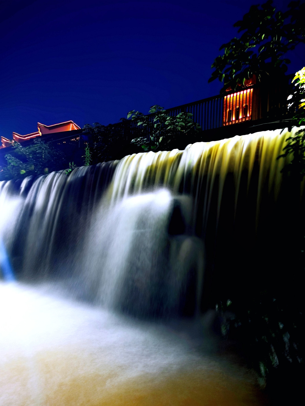 望向平静的江面,江面开始泛起橙黄色的灯光,就好像是金灿灿的金箔铺满了整个江面,百里柳江两岸霓虹闪烁,柳江上飞架起总共一十八座造型各异的桥梁,每座桥都是一处绝佳的观景平台,市区沿江山体、瀑布、音乐喷泉在色彩景观灯的照耀下,犹如一串晶莹剔透的彩色夜明珠,倒映在恍若银河的九曲柳江,汇成壶城夜色中的人间美景。大型水上音乐喷泉全长315米,超过排名世界第一的阿拉伯迪拜喷泉和世界第二的美国拉斯维加斯喷泉,是目前世界上江面最大的升降浮式喷泉,每晚8点准时表演,时长15分钟。最特别的应该是从窑埠古镇到文庙附近亚洲最大的人工瀑布,人工瀑布从蟠龙山的半山流下,涓流化成银链,一倾如注,仿如在演奏一曲动人的交响乐,山上楼台亭榭和宝塔交相辉映,勾勒出一幅梦幻山水画卷,人工瀑布群非常逼真,瀑布从无数怪石间隙涌出,效果自然真切,尤其是瀑布群不但水势湍急而且发出巨大的轰鸣声,如果不知内情的游人来到这里,真会以为柳江边历来就有如此壮观的瀑布群。