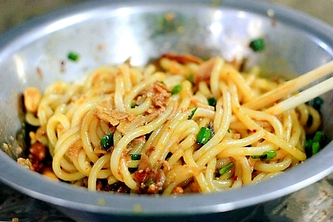 柳州螺蛳粉,一个像臭豆腐一样的存在,爱的人爱它内容丰富,味道鲜美,不爱的人无法忍受它那臭臭的气味,除了常吃的汤粉外,我更偏爱干捞粉,尤其是藏在小巷中的大华干捞粉,被誉为“柳州最好吃的干捞粉”。建议二两起点,和汤粉完全不一样的口感,干捞粉精华都在拌料上,有叉烧碎、花生碎、猪油渣、葱末、蒜末,还有一种黑黑的好像叫做牛腊巴,将筋道的圆粉和拌料搅拌均匀,让肉沫和酱汁充分融入到粉里面,然后开吃,填实胃里的每个缝隙,吃起来酥酥脆脆,味道很有层次感。