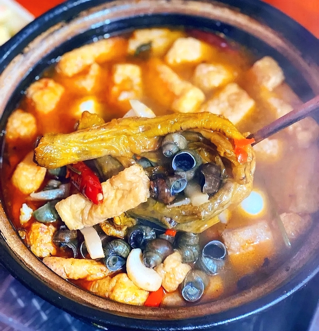 烈日炎炎,回到酒店附近,自然是要品尝一下风靡万千吃货的肥螺庄,螺狮鸭脚煲是他家的招牌,鸭脚先炸,然后放到高汤锅里焖,汤底都是每天新鲜现熬,熬出来的高汤鲜香扑鼻,肉香浓郁,飘来的香味就令人垂涎三尺,螺蛳和炸脆又泡软的鸭脚同煲,加入空心菜、酸笋、芋头、花生,满满一锅,石螺分量很足,个头大且螺肉脆口,油炸过的鸭脚都是黄灿灿的大长腿,每一只都煮得软烂入味,轻轻一咬就能轻松的将皮带肉啃到嘴里,喝一口汤,醇香浓郁,豆腐泡一口爆汁,豆皮薄而不破,十分入味。只用短短十年,肥螺庄在柳州从一家门店迅速开到了六家门店,毫不夸张地说,它几乎霸占了整条街。