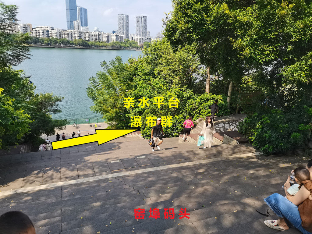 12:00到达山脚,左转走五分钟可以到达窑埠古镇的窑埠码头。可以从窑埠码头楼梯右侧下到柳江的亲水平台,可以看看江景,也可以在瀑布开发时间感受下站在瀑布下的感觉,瀑布开放时间:①工作日19:30-22:30;②周末、节假日10:00-12:00、14:30-16:30、19:30-22:00。下到亲水平台后可以往前走,走到右侧的第二个向上的楼梯(水上公交后)时可以上去,又可以回到窑埠古镇。在古镇可以解决中餐,但古镇商铺大多是下午开始营业,中午时间螺丝粉店还是开的,吃碗螺丝粉再来杯奶茶也不错。我们没有选择在古填解决中餐,因为想吃饭,所以继续前行,先到达古镇马路对面的柳州工业博物馆,然后再到市民广场旁的乌托邦音乐城吃饭,乌托邦音乐城及其周边的阳光100小区的餐饮比较多。晚上可以来古镇吃晚饭,然后看夜景,夜景也是很漂亮的。