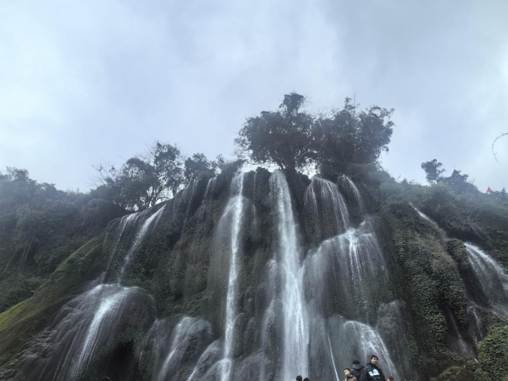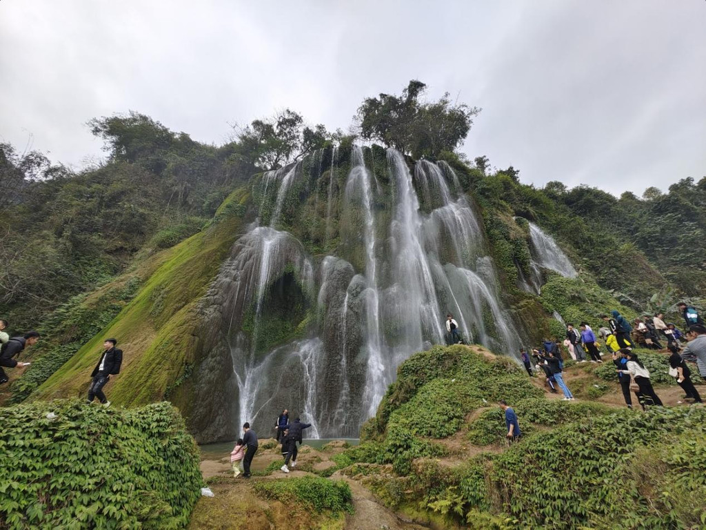 去不了德天瀑布,低配版不排队的路边瀑布代替。驱车路过三叠岭瀑布,水瀑上石头错落分布,导致上游水流分成三叠下落,伴着风,将水汽吹散在空气里,落在游客的发梢,笑容里,或是镜头上。