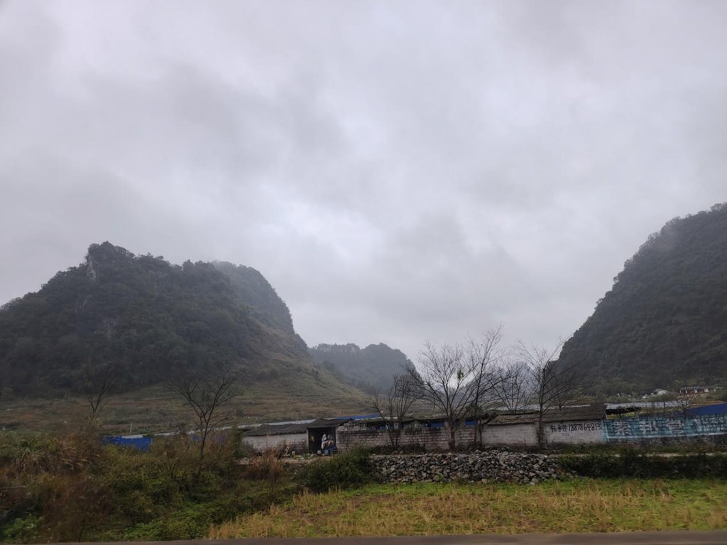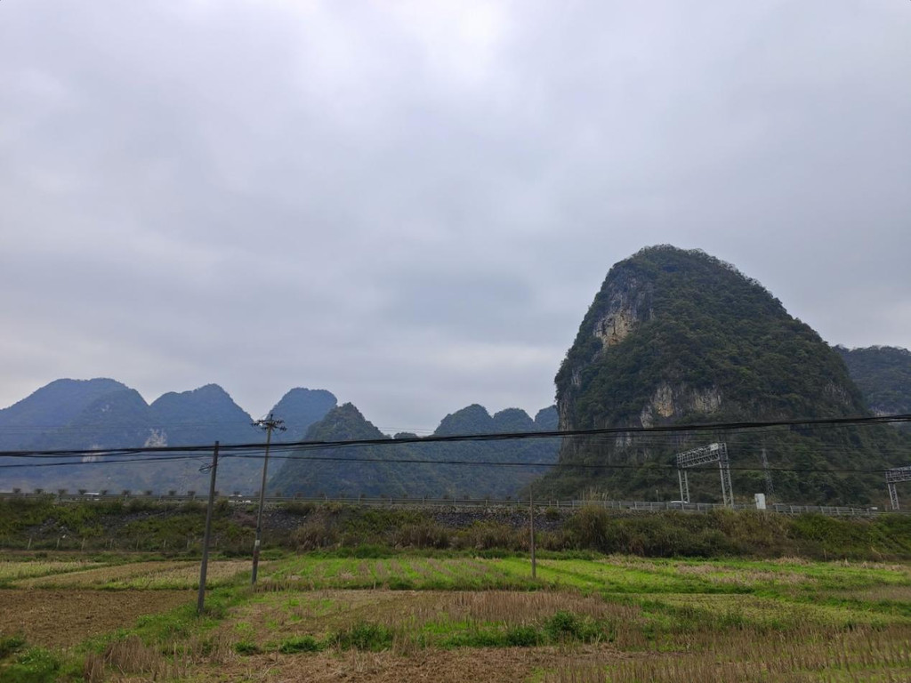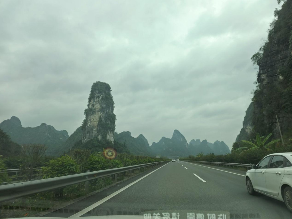 柳州和南宁预报有雨,一路往西,天由阴转晴又转多云。300公里的旅途,因为沿途的山峦,田野,隧道,树木,跨江大桥,路程而变得奇妙。天空放晴时,山峦叠嶂,层次分明。雾蒙蒙的时候,有种腾云驾雾的错觉。喀斯特地貌将山雕刻成了独立的山峰,或是一刀切的连绵群峰。