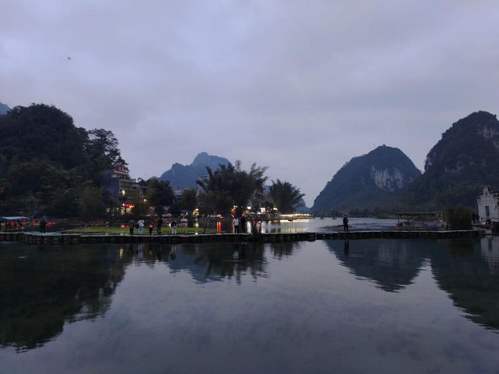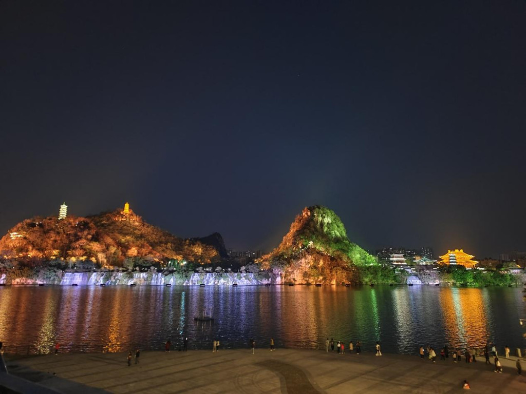 这碗属于我的螺狮粉综合起来是不错的。鸭脚是腐皮的,酸笋是重味道的,汤底是上头的,但腐竹片再大一些才过瘾。没吃过别家,但这家味道是不错的。老公说如果非要排一个小时才吃到,反而就不那么香了。我恰恰相反,觉得更美味。柳江边,有个人工沙滩。跨江对面,文庙和古镇的灯光,把黑夜点亮了,有点像86版西游记。