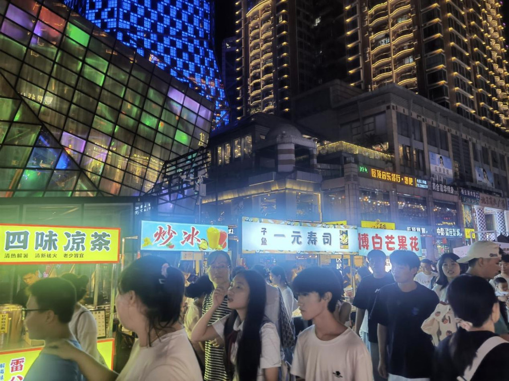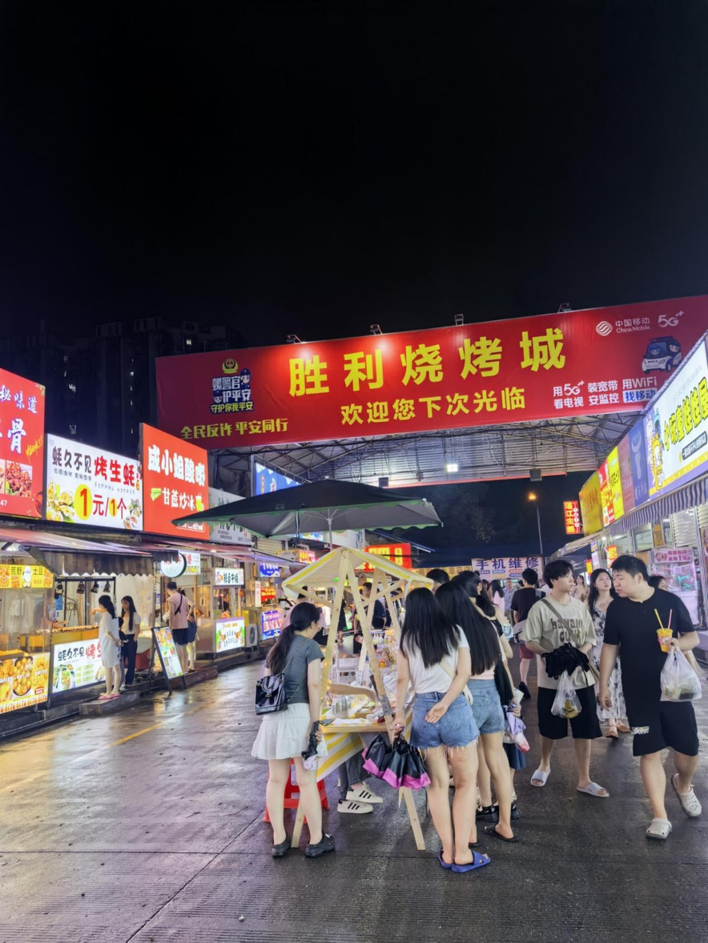 开车去到的时候正要开始,但奇怪的是竟然无音乐!无音乐的音乐喷泉,绝了!可以自己配个音乐。看完喷泉,隔壁就是风情港夜市。这里摊位多,有食有玩有文创,人山人海,人流密集。首先让大家感受一下。
