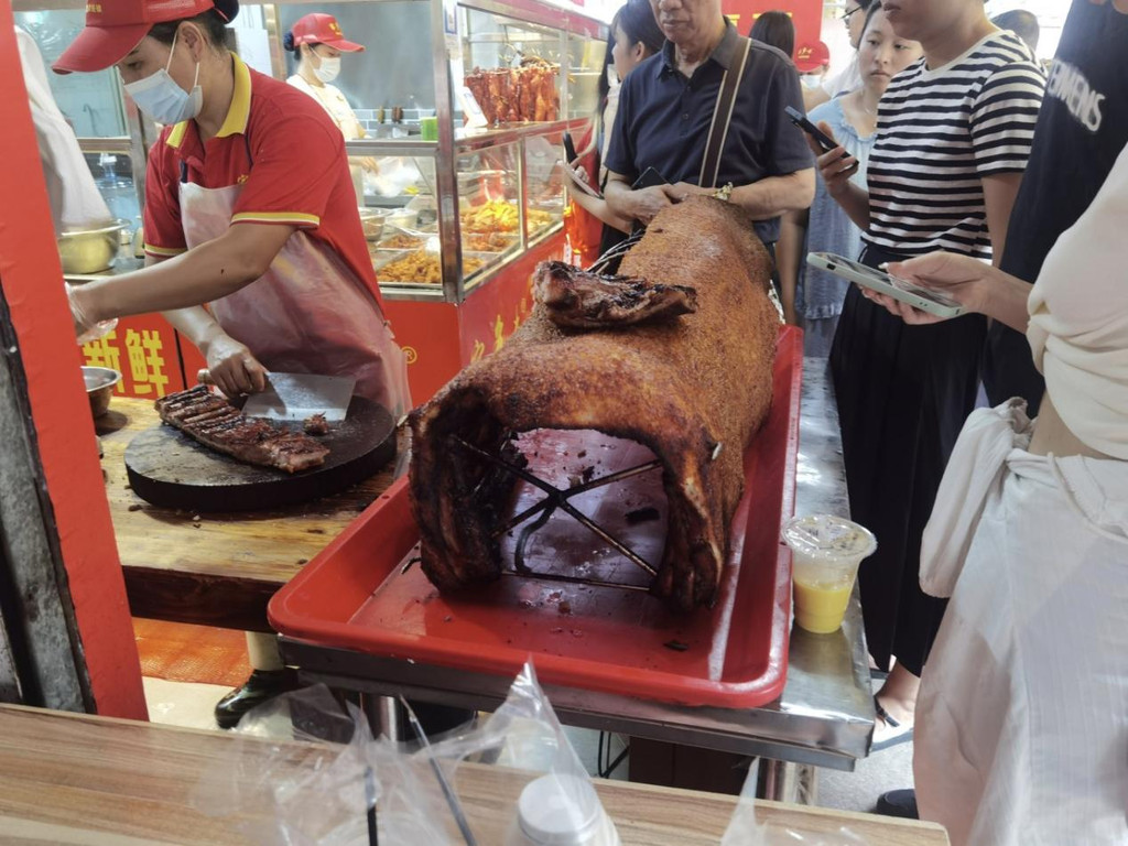 绵绵糕,味道就如小时候吃的米通,满满的米香味,但口感软绵绵,不太甜,好吃。旁边白色的是桂花糕,有点似伦敦糕的味道,但更糯,软绵绵的,有淡淡的桂花香味,5块钱/盒。最爱黄色玉米味。好多买烧腊的档口,大烧猪。总之,这里就是吃货的天堂啊。