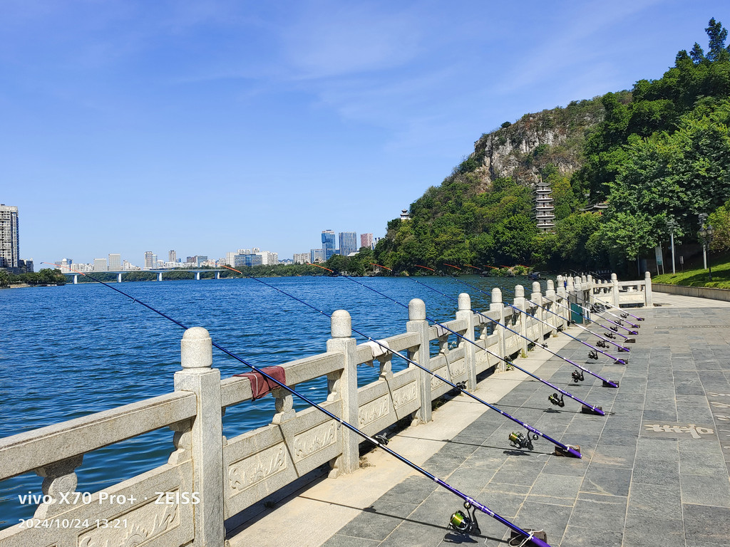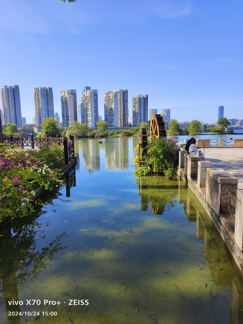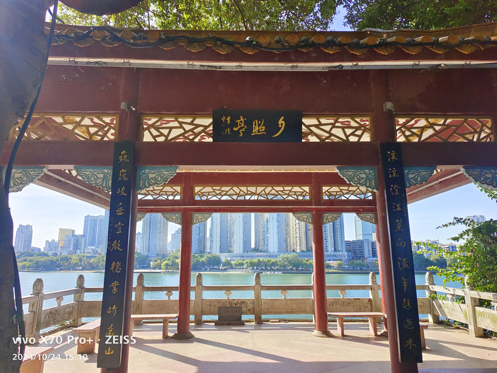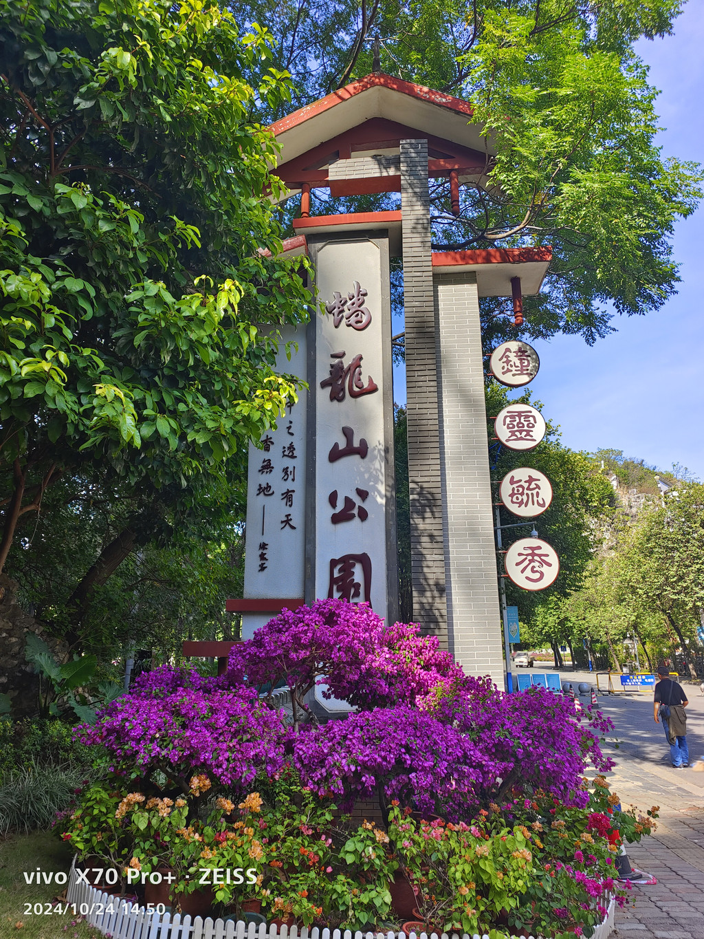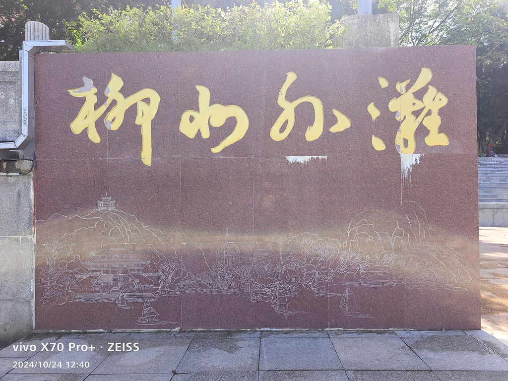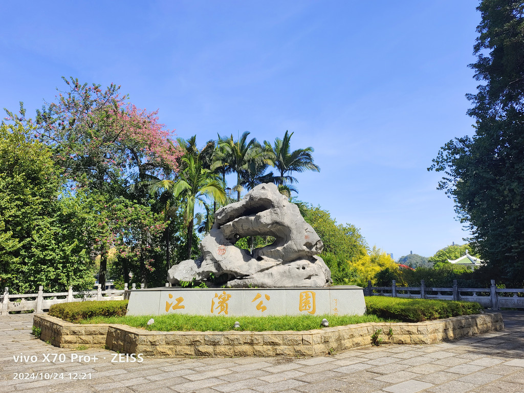 2024年10月24日中午12点半,我们乘19路公交在柳江南桥头下车,沿江南岸就是柳州江滨公园。柳州市江滨公园位于柳州市区柳江南岸,处于“百里柳江.百里画廊”核心地带,全长 1.5 公里,总面积14.21万平方米。公园依山傍水、景色优美,集游览、休闲、娱乐、健身、防洪于一体,为广西最早的沿江大型开放性公园,是全国先进文化广场之一,享有“柳州外滩”美誉。1953年,市园林处在柳江南岸浮桥头进行沿河绿化,种下一批法国梧桐。1955年,在此 辟建“河滨公园” ,面积约1公顷。1959年,市人委拨出专款建重檐四方亭(望江亭)、攒 尖顶圆亭各1座,修整园路,设置石桌石凳,筑挡土墙,公园面积增至1.5公顷,改称“江滨 公园”。“文化大革命”期间,公园设施被捣毁,园林失修。1982—1983年,在柳州大桥南 端筑900米长土墙,营造公园绿地。1984年初,市政府审订《江滨公园规划建设方案》。4月, 在南岸兴建“归来亭”、“望江亭”等。10月,开展“爱我龙城,建我柳堤”社会赞助活动, 在北岸修建柳堤。1986年8月, 在堤坪上立“柳堤” 纪念碑。同年,柳堤游园基本建成。1987年10月, 建成赵家井景点。园内常有各路歌手对歌。位于赵家井景点东北侧900余米的 蟠龙山临江耸立,形如蟠龙,主峰海拔196.9米。山顶原有一座清代古塔,高7层,属楼阁式 风水塔; 临江枝峰海拔153米,山上林木葱茏,多奇石异洞,有王氏山房、东林洞、盘古庙 等古迹。1991年,开发建设蟠龙山风景区。1992年,制订蟠龙山公园的总体规划,在景区恢 复东塔(定名文光塔)、榕荫古渡、蟠龙山道、“山川并茂”牌坊、王氏山房、盘古庙等, 并建蟠龙塔、 文昌阁和安排一批楹联匾额、 摩崖石刻和艺术雕塑。 景区总面积11.48公顷 , 柳州市江滨公园公园建设根据江岸地形高差特点,集自然风光与人工园林造景,以远山近水为大背景,结合山水园林城市风貌建设,按分隔、调和,韵律等园林构图原理,对亭台楼榭、景观植物进行精心布局,采用借景、对景、障景、夹景、框景、点景等园林手法,创造出一种简洁朴素、淡雅明快的风格,形成步移景异的多视角、多层次的园林空间环境,使江景园景城景自然交融。主要景区有: 壮乡歌海区、争奇斗艳区、翠影绿波区、古井清泉区、古代寓言故事区等。主要景点有防洪纪念碑、古庾家码头、浮雕景墙、赵家井等。