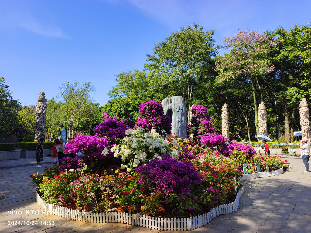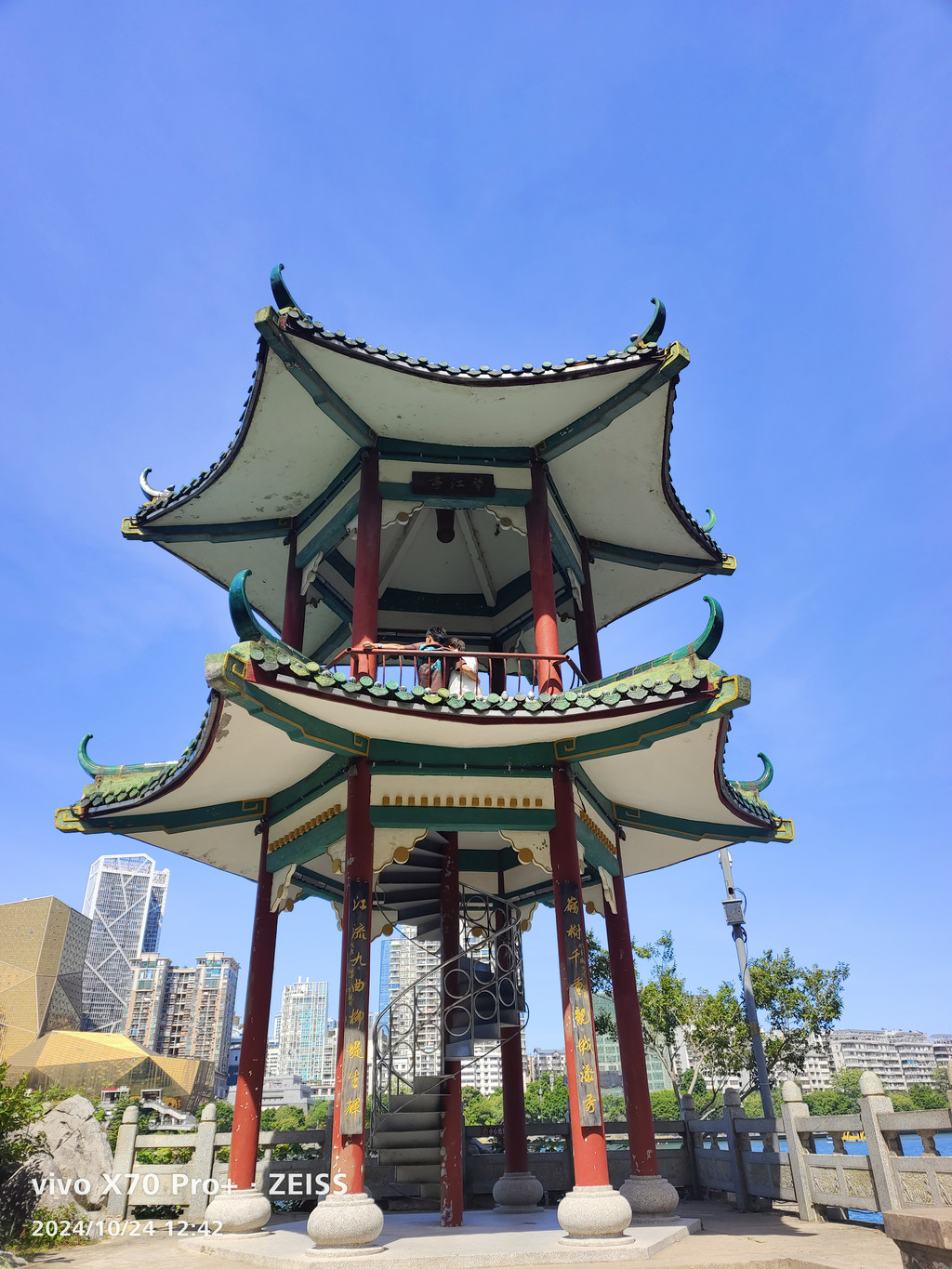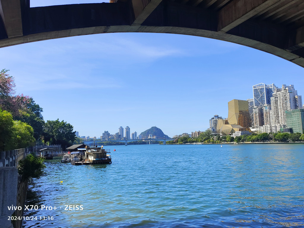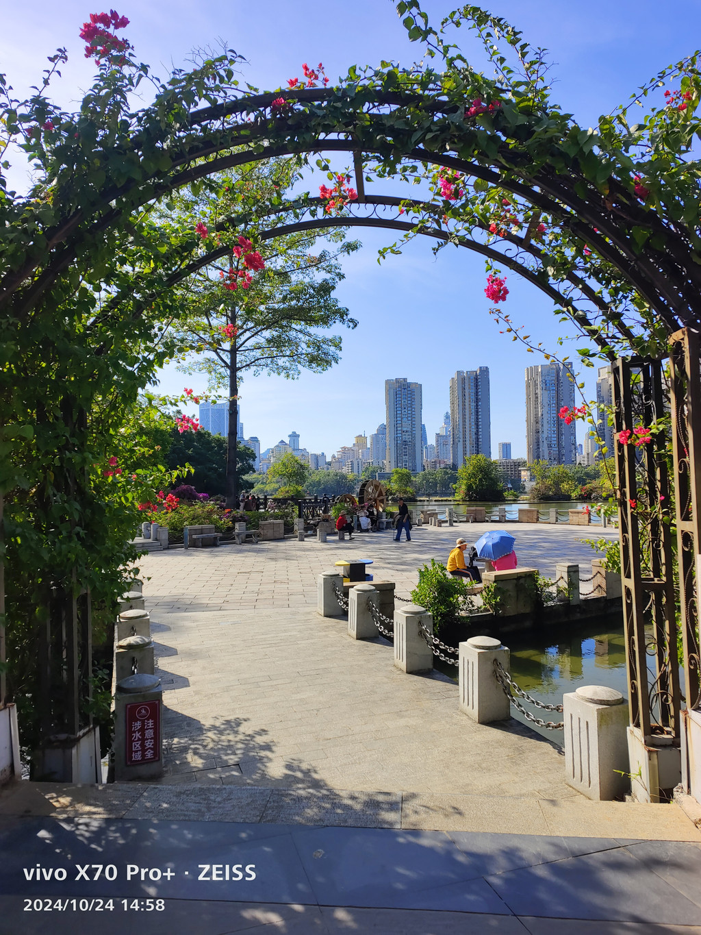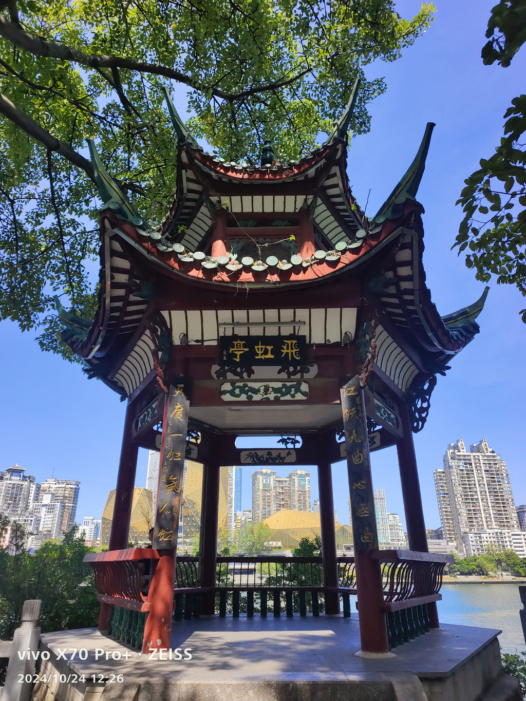 2024年10月24日中午12点半,我们乘19路公交在柳江南桥头下车,沿江南岸就是柳州江滨公园。柳州市江滨公园位于柳州市区柳江南岸,处于“百里柳江.百里画廊”核心地带,全长 1.5 公里,总面积14.21万平方米。公园依山傍水、景色优美,集游览、休闲、娱乐、健身、防洪于一体,为广西最早的沿江大型开放性公园,是全国先进文化广场之一,享有“柳州外滩”美誉。1953年,市园林处在柳江南岸浮桥头进行沿河绿化,种下一批法国梧桐。1955年,在此 辟建“河滨公园” ,面积约1公顷。1959年,市人委拨出专款建重檐四方亭(望江亭)、攒 尖顶圆亭各1座,修整园路,设置石桌石凳,筑挡土墙,公园面积增至1.5公顷,改称“江滨 公园”。“文化大革命”期间,公园设施被捣毁,园林失修。1982—1983年,在柳州大桥南 端筑900米长土墙,营造公园绿地。1984年初,市政府审订《江滨公园规划建设方案》。4月, 在南岸兴建“归来亭”、“望江亭”等。10月,开展“爱我龙城,建我柳堤”社会赞助活动, 在北岸修建柳堤。1986年8月, 在堤坪上立“柳堤” 纪念碑。同年,柳堤游园基本建成。1987年10月, 建成赵家井景点。园内常有各路歌手对歌。位于赵家井景点东北侧900余米的 蟠龙山临江耸立,形如蟠龙,主峰海拔196.9米。山顶原有一座清代古塔,高7层,属楼阁式 风水塔; 临江枝峰海拔153米,山上林木葱茏,多奇石异洞,有王氏山房、东林洞、盘古庙 等古迹。1991年,开发建设蟠龙山风景区。1992年,制订蟠龙山公园的总体规划,在景区恢 复东塔(定名文光塔)、榕荫古渡、蟠龙山道、“山川并茂”牌坊、王氏山房、盘古庙等, 并建蟠龙塔、 文昌阁和安排一批楹联匾额、 摩崖石刻和艺术雕塑。 景区总面积11.48公顷 , 柳州市江滨公园公园建设根据江岸地形高差特点,集自然风光与人工园林造景,以远山近水为大背景,结合山水园林城市风貌建设,按分隔、调和,韵律等园林构图原理,对亭台楼榭、景观植物进行精心布局,采用借景、对景、障景、夹景、框景、点景等园林手法,创造出一种简洁朴素、淡雅明快的风格,形成步移景异的多视角、多层次的园林空间环境,使江景园景城景自然交融。主要景区有: 壮乡歌海区、争奇斗艳区、翠影绿波区、古井清泉区、古代寓言故事区等。主要景点有防洪纪念碑、古庾家码头、浮雕景墙、赵家井等。