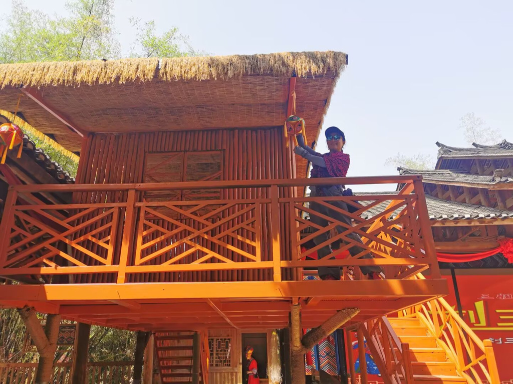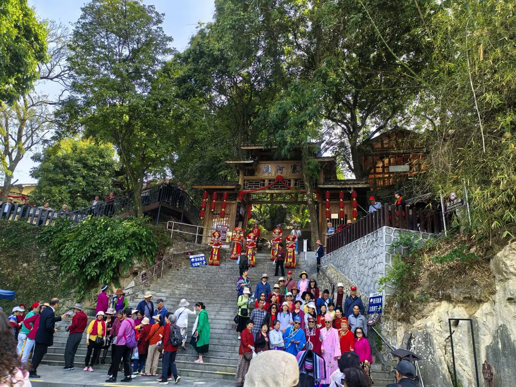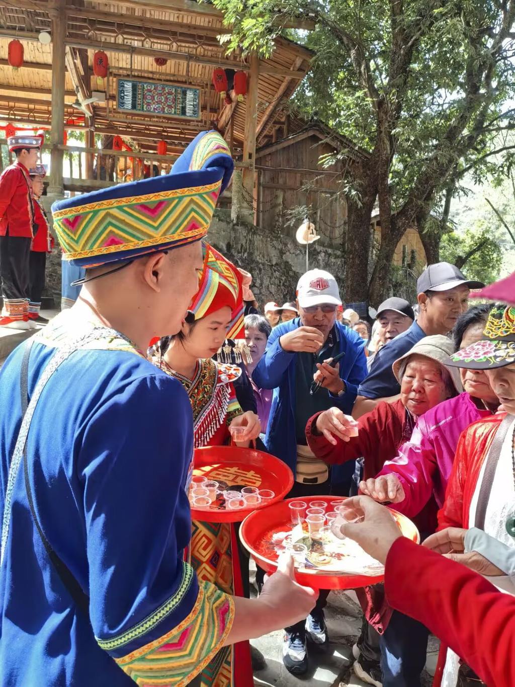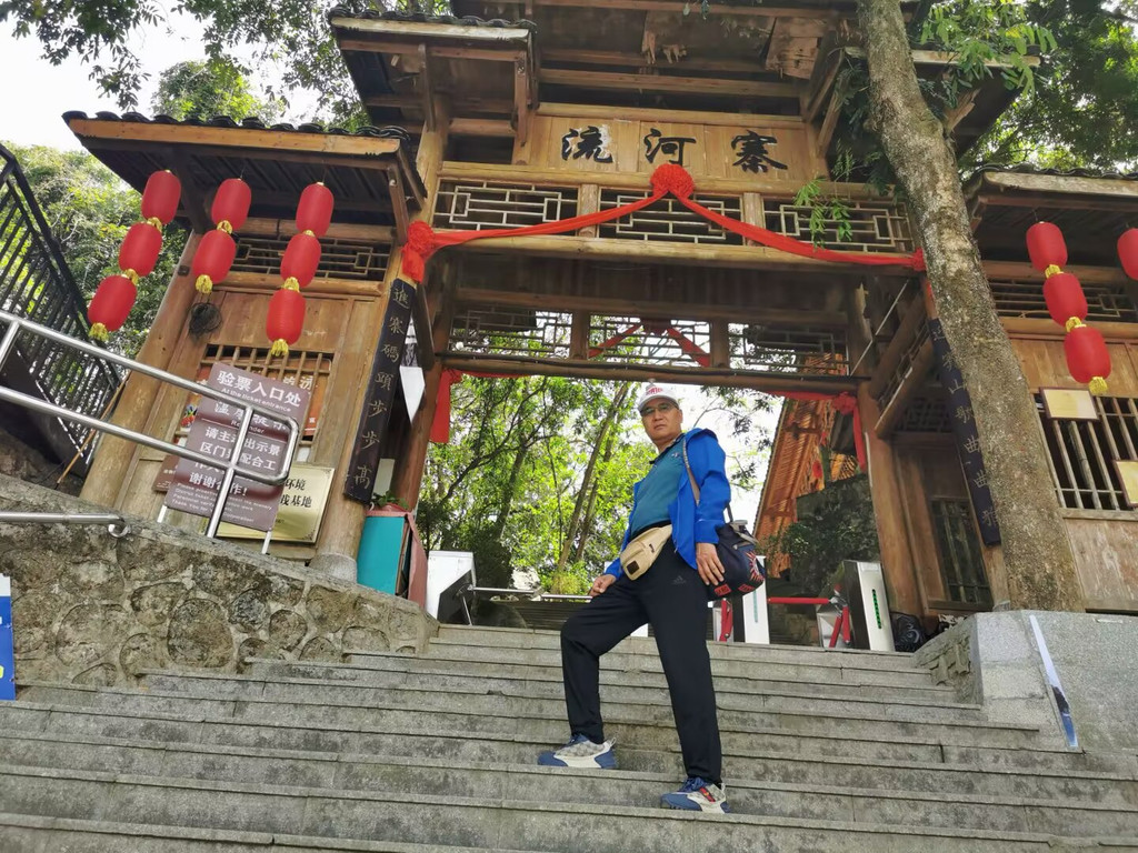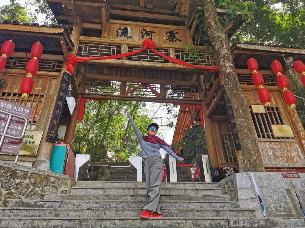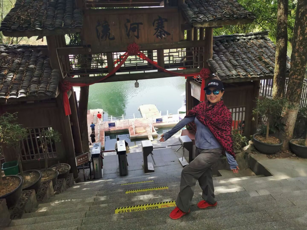 跟随导游一路歌声一路景,一船人文一船情,跟随导游的介绍,我们来到了刘三姐故里景区叫“流河寨”。映入眼帘的是寨门台阶上,站着身着民族盛装的姑娘小伙子们,要和我们船上的游客们对歌才能上岸进寨子。其实导游三妹一路上,已经做好了准备,给大家发了歌本,教大家对应谱子学了几首山歌,还选出了四位男游客穿戴打扮成电影《刘三姐》中莫老爷和秀才模样,准备应对呢。岸上的姑娘们发出问答山歌,很简单歌谱上有,大家照谱应答顺利登岸进寨了。