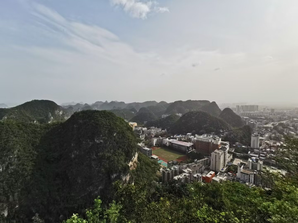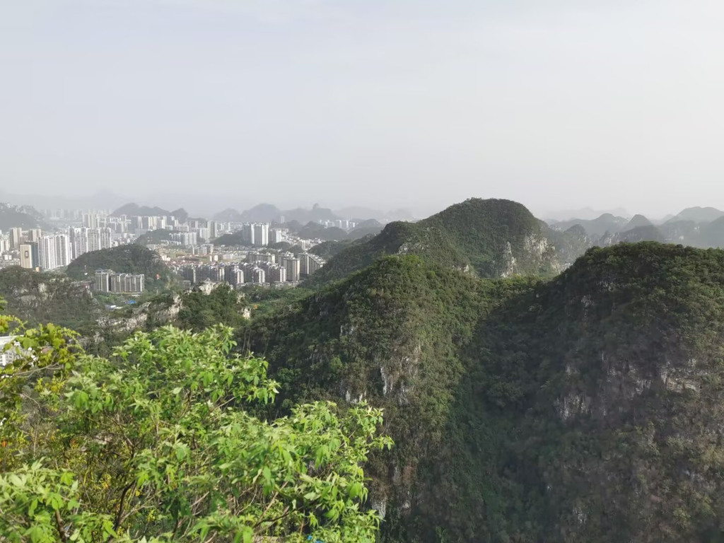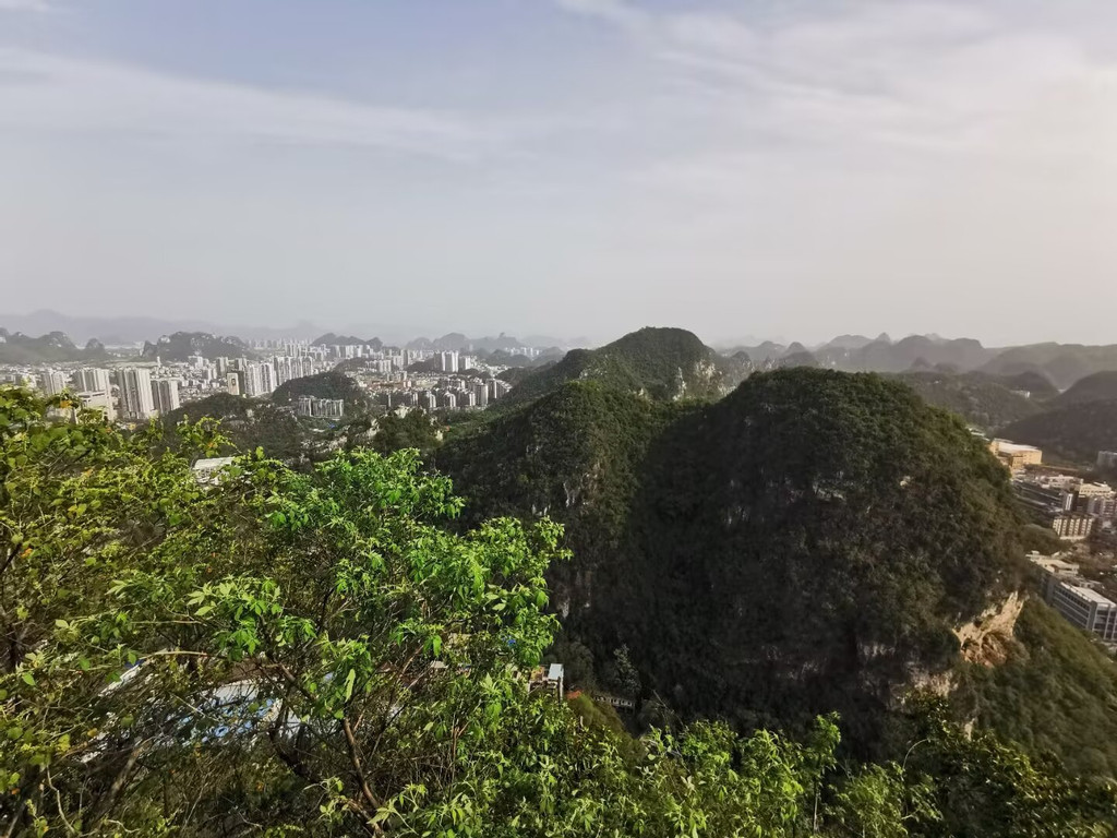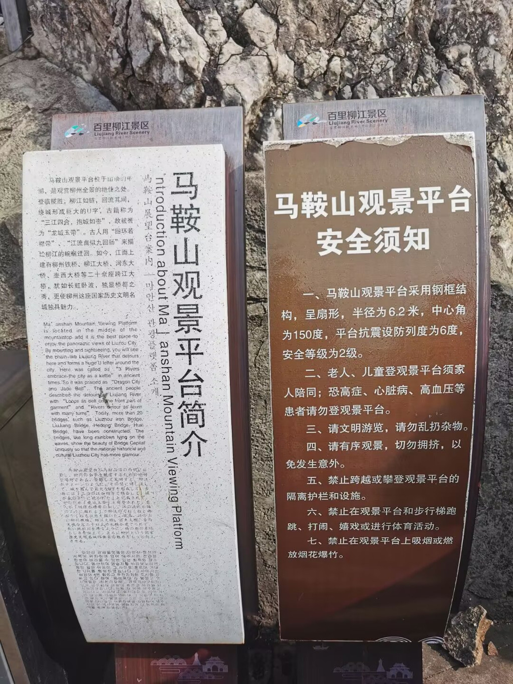 马鞍山因其形如马鞍而得名,位于柳江南岸的市中心,与鱼峰山东西呼应,是柳州市中心区的一座最高山峰之一,主峰海拔270米,乘内部直达电梯从山脚达山顶,放眼眺望,柳州城全景尽收眼底,山水流长、楼宇巍扬,是寻幽探胜、登高望远的最佳去处。下山后打车到柳江对面,再看看马鞍山,形似极像马鞍!