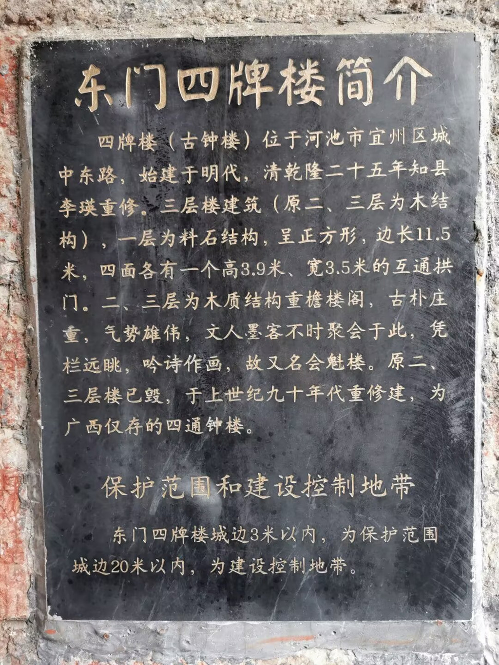 下午附近市民广场散步,浏览一下刘三姐故里的城区。在宜州市东侧,有一座建于乾隆二十五年的牌楼,时称"会魁楼",又称"四牌楼"。此楼位于十字路口,形成东西南北四个门洞,内外相通。四牌楼楼高三层,一楼全用大型细凿条石砌成,呈四方形,工艺精巧。