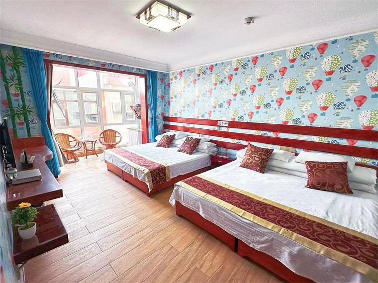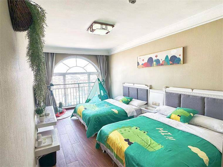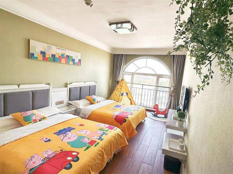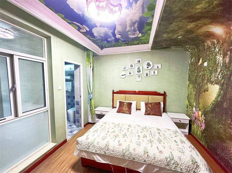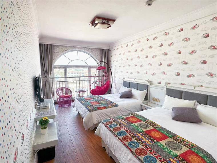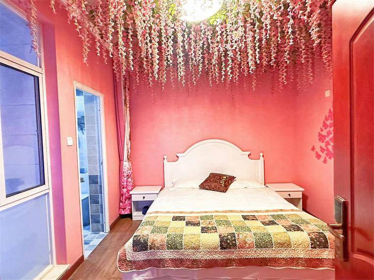 浪漫情侣大床房和粉色大床主题房,特别适合情侣住宿。落地阳台,因为位置是在临街站在阳台上可以把热闹的夜市一览无余,晚上吹着凉凉的风,惬意极了,而且房间的卫生也很干净,很温馨真的棒极了。