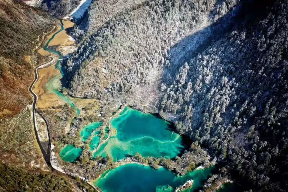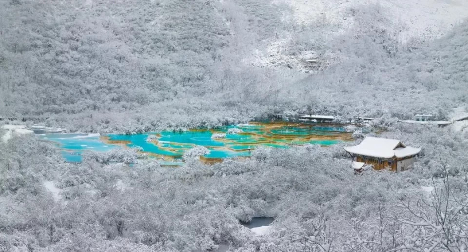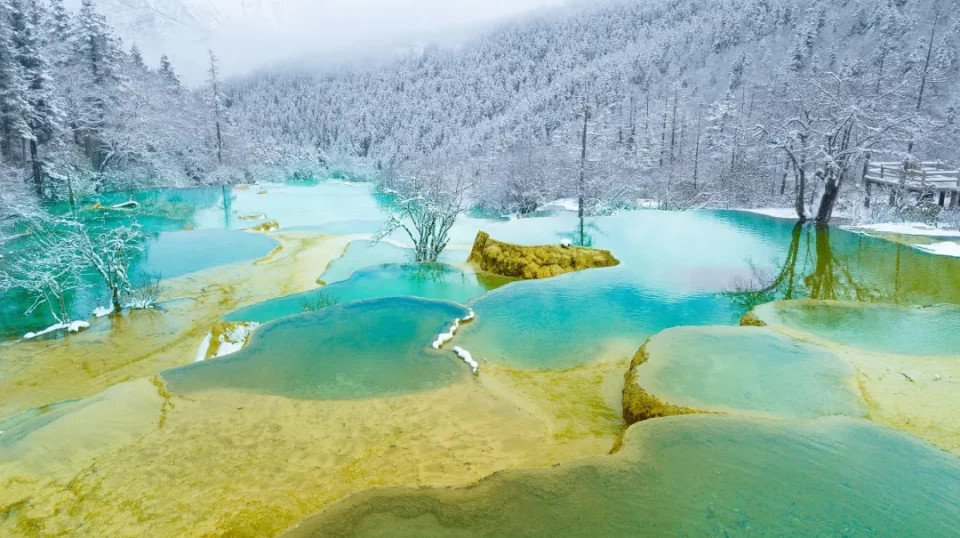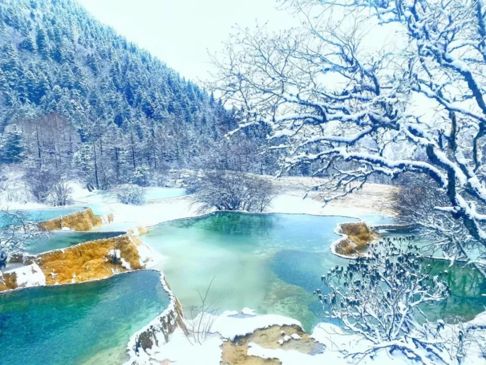 冬日黄龙一汪清澈又多彩,灵动又优美,明艳又冷冽的水波,就像是一幅幅令艺术大家沉醉而描摹的名画。