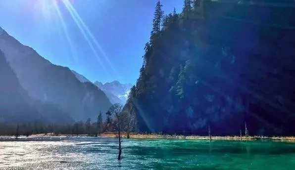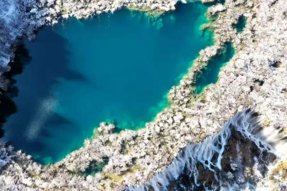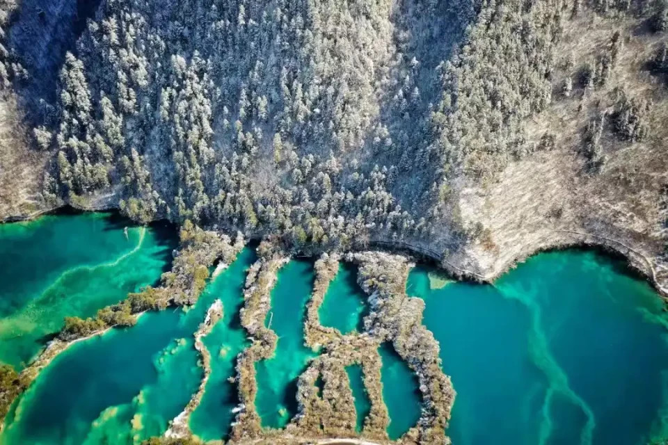 冬日的九寨时而温柔时而恬淡,阳光倾泻洒下来,遍布整片九寨大地,让人仿佛沐浴在一场浪漫的冬日童话世界里。