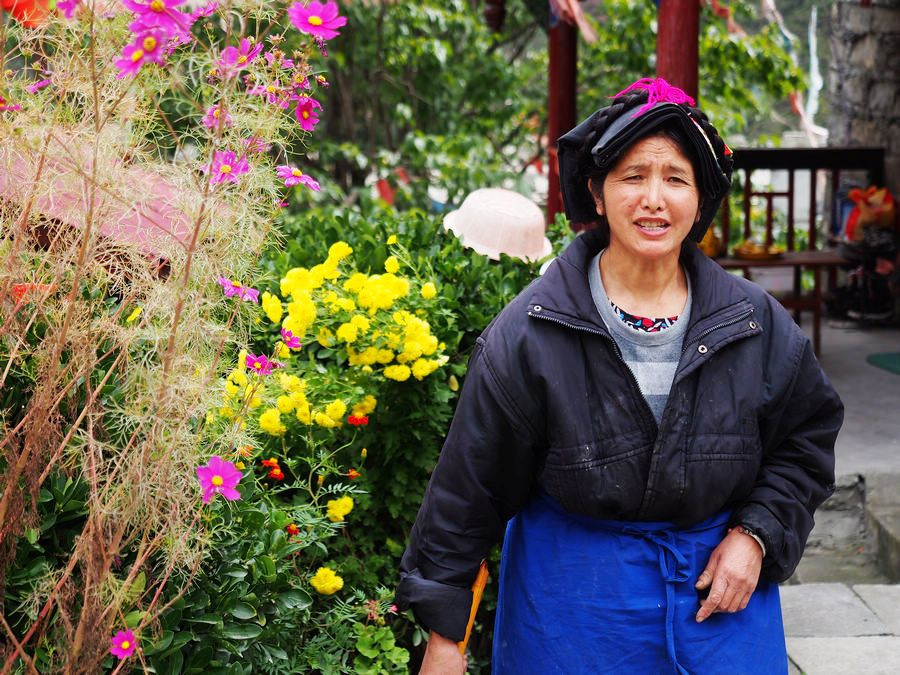 顺着路往高处走走,一个正在自己家院子门口劳作的女人,头上还缠着加绒藏族的传统帕子,身上的衣服,却都是简便的成衣了。