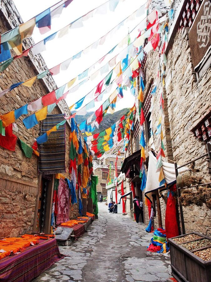 这条比较宽的村道上,挂满了彩色的经幡,几个穿着戏服的演员走过。