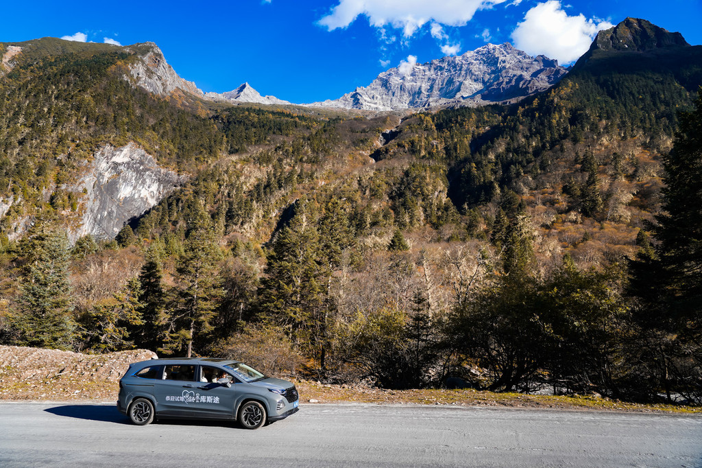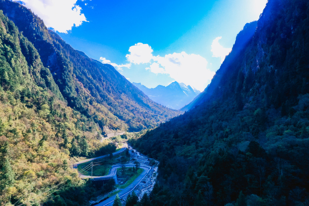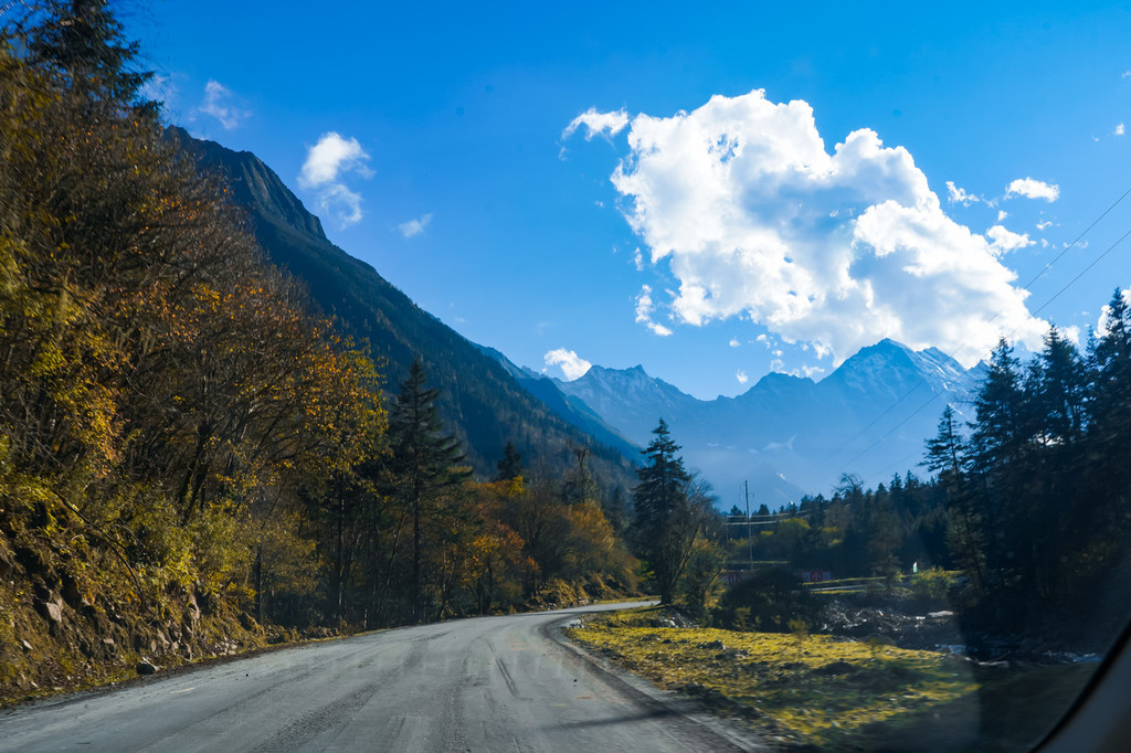 伴着雪山和彩林的山间公路