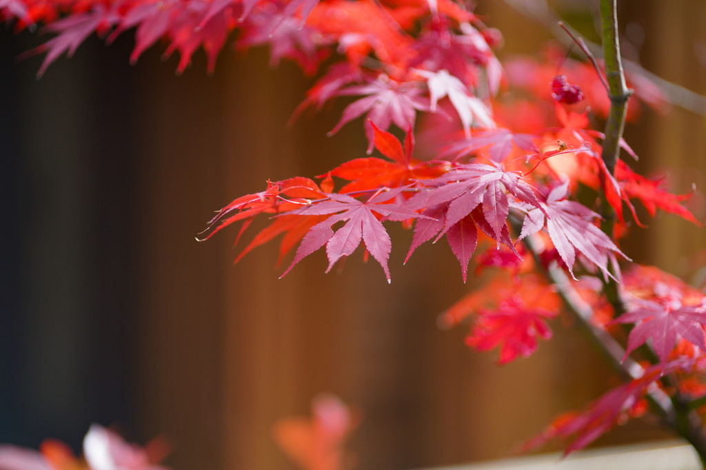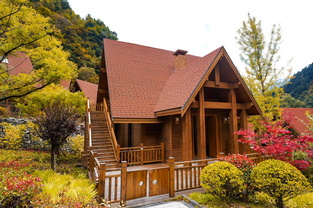 秋天这里真的很美,木屋外都是红色的枫叶,山上是漂亮的彩林。
