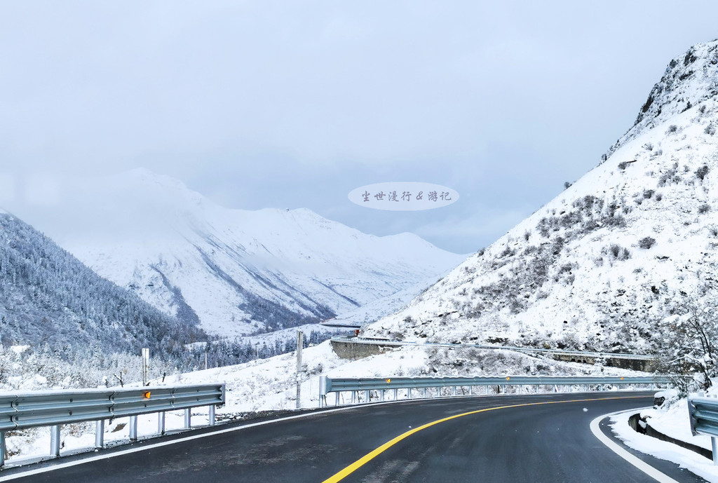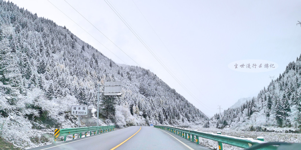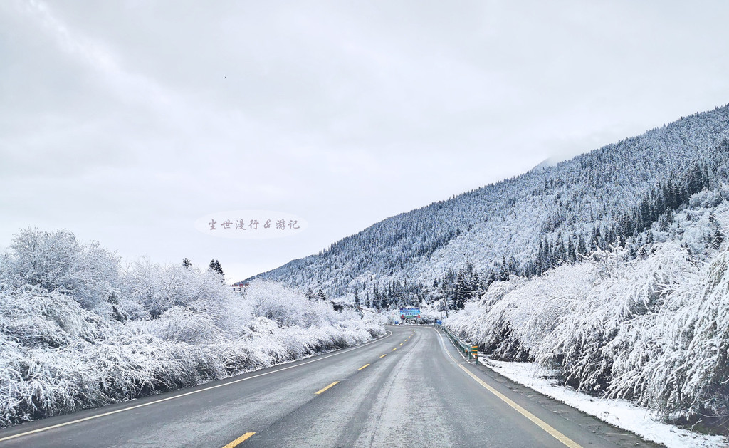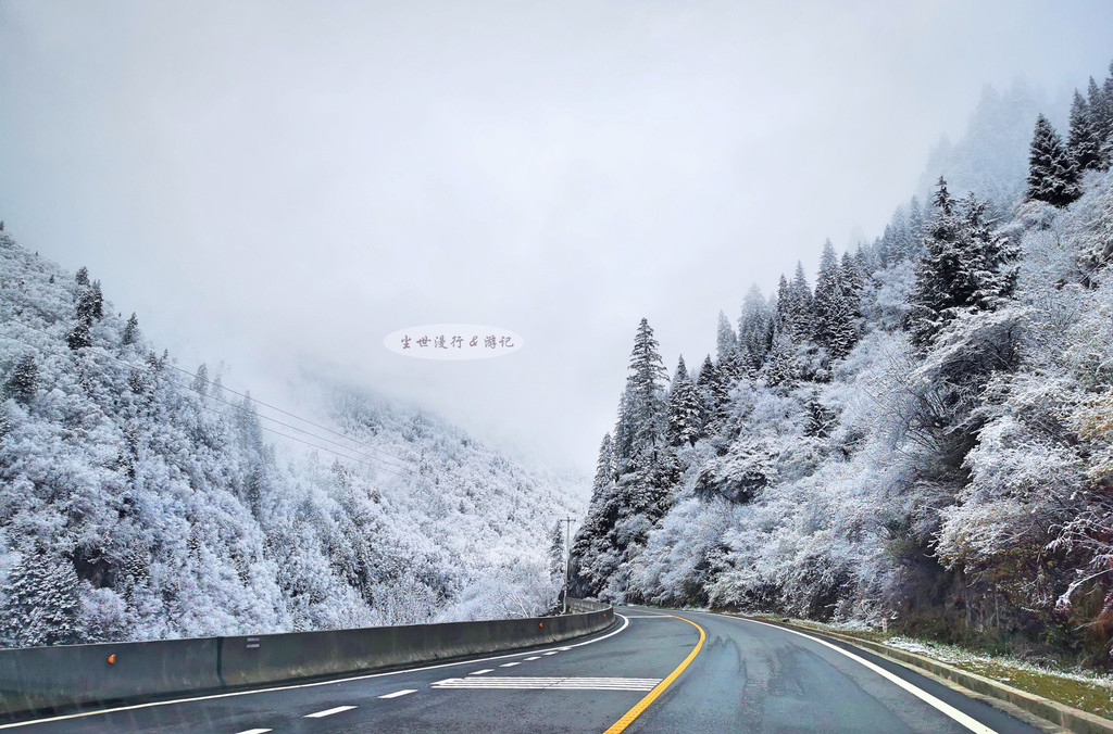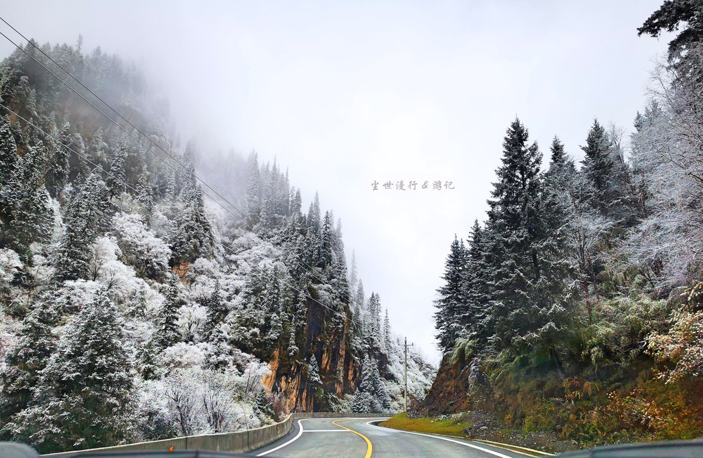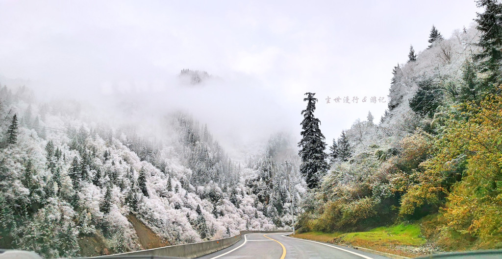 海拔渐渐在上升,车子的前方出现了雪林,雾霜缭绕着雪山朦朦胧胧。