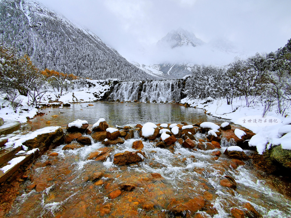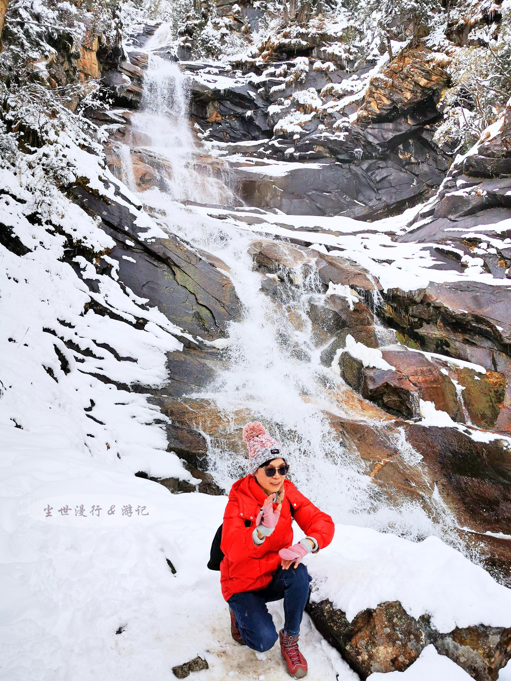 下车往前走,便见一座小型瀑布,瀑布水潭下是铁锈红的石滩,铁锈红石块上覆盖着软软的白雪。