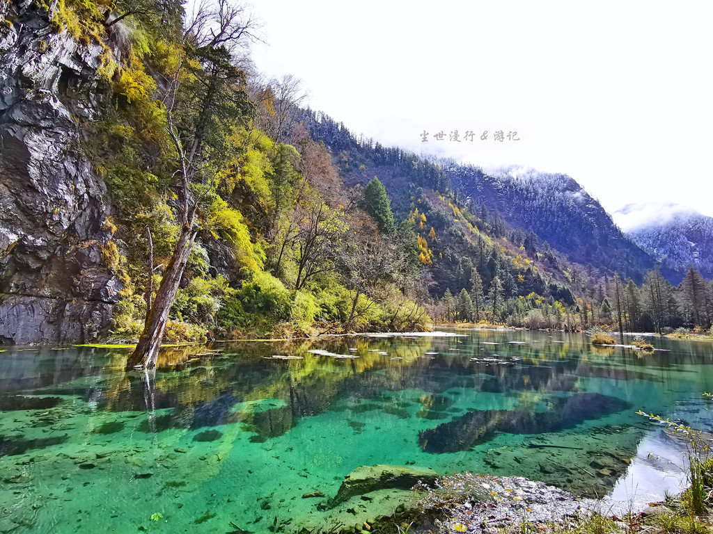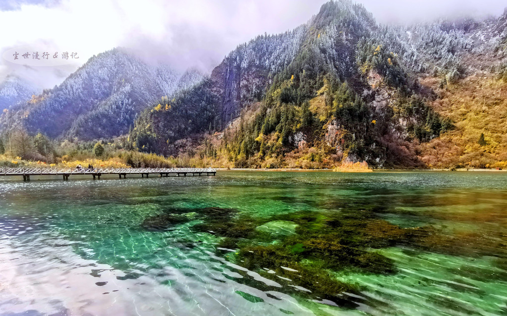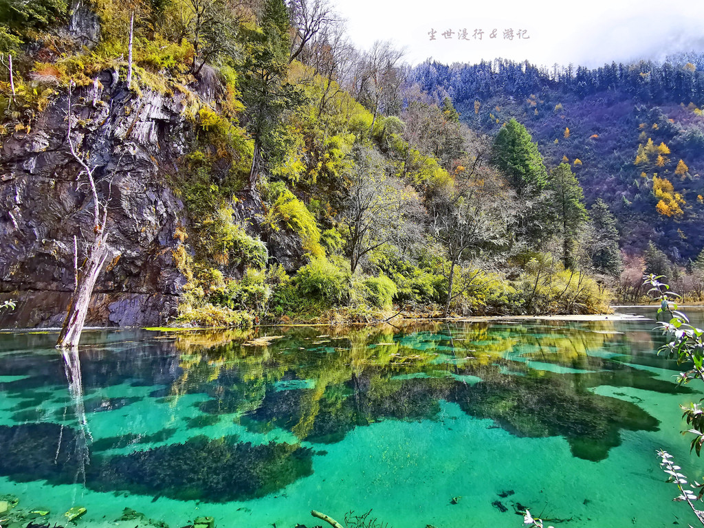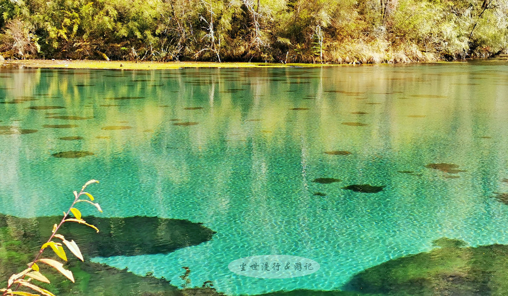 游步道左侧的湖泊与九寨沟五花海景色极其相似,清澈的湖水、五彩的藻类与沉寂的树干构建了令人惊叹的水下世界,极富色彩感。