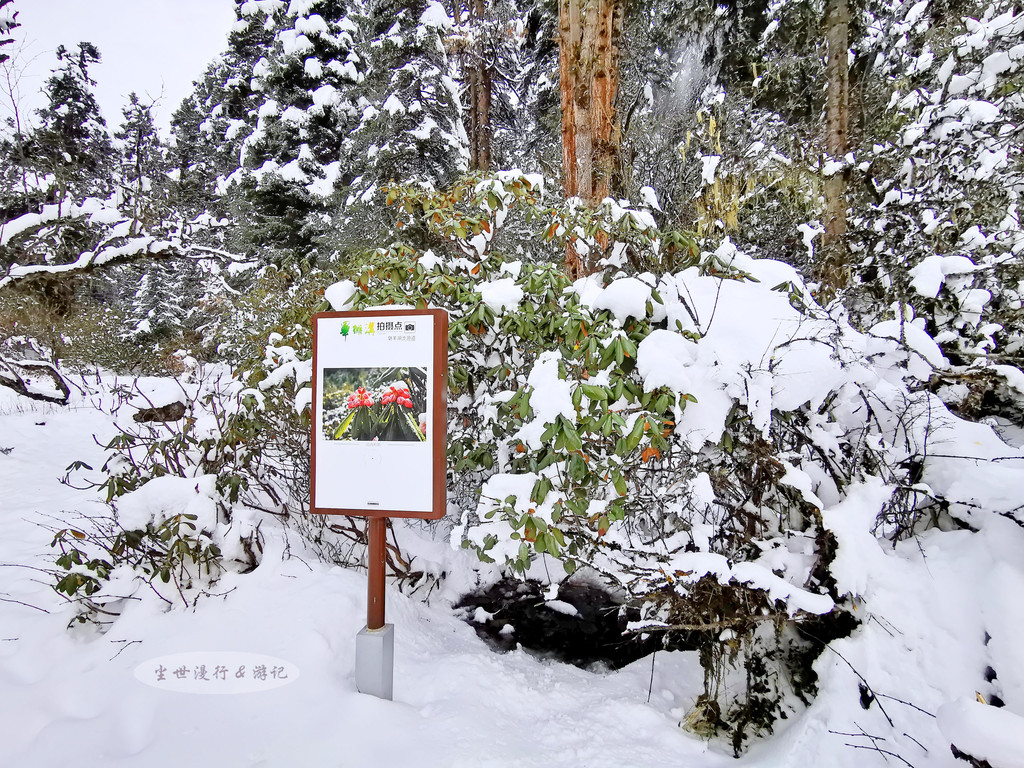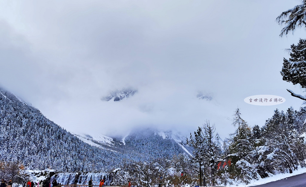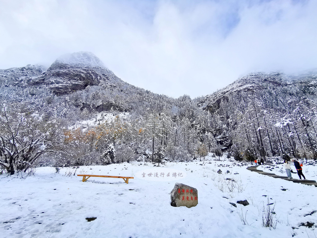红杉林旁是“青草坪”,已被白雪覆盖了。站在青草坪上可以观赏雄峰峻岭,只是那“倒沟冰川”被满山的云雾缭绕着,隐隐地露出冰川的模样。
