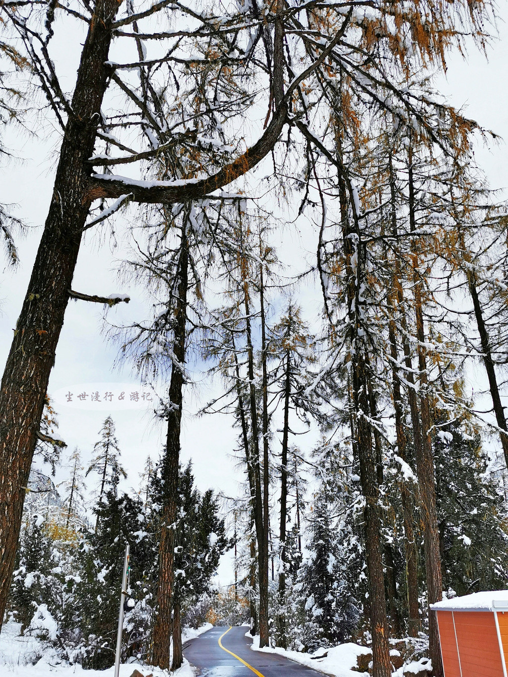 山路旁是一片“红杉林”。昨夜的一场大雪,为深橙色的红杉披上了“白丝巾”,红杉旁还有小雪人作伴呢。