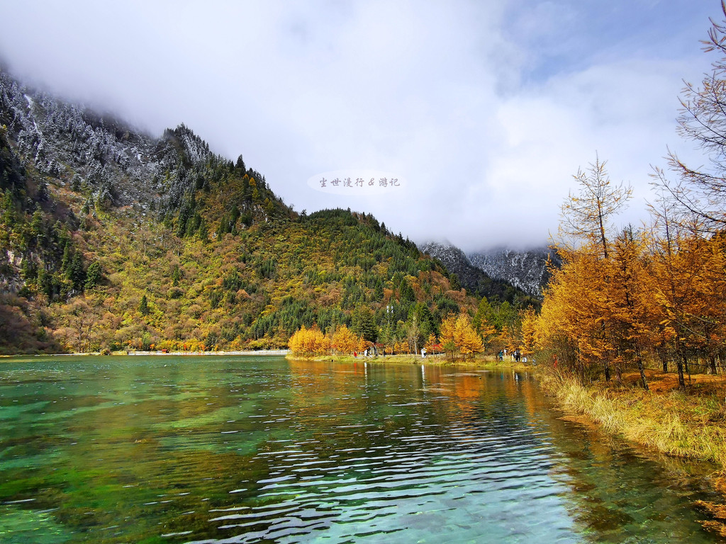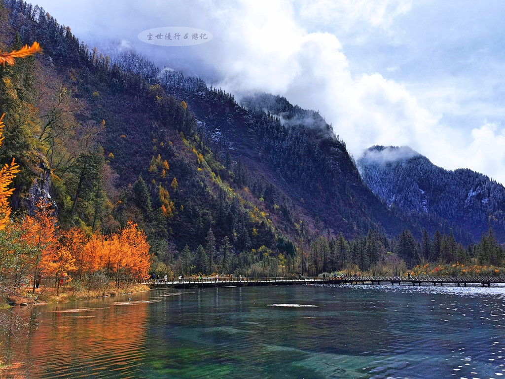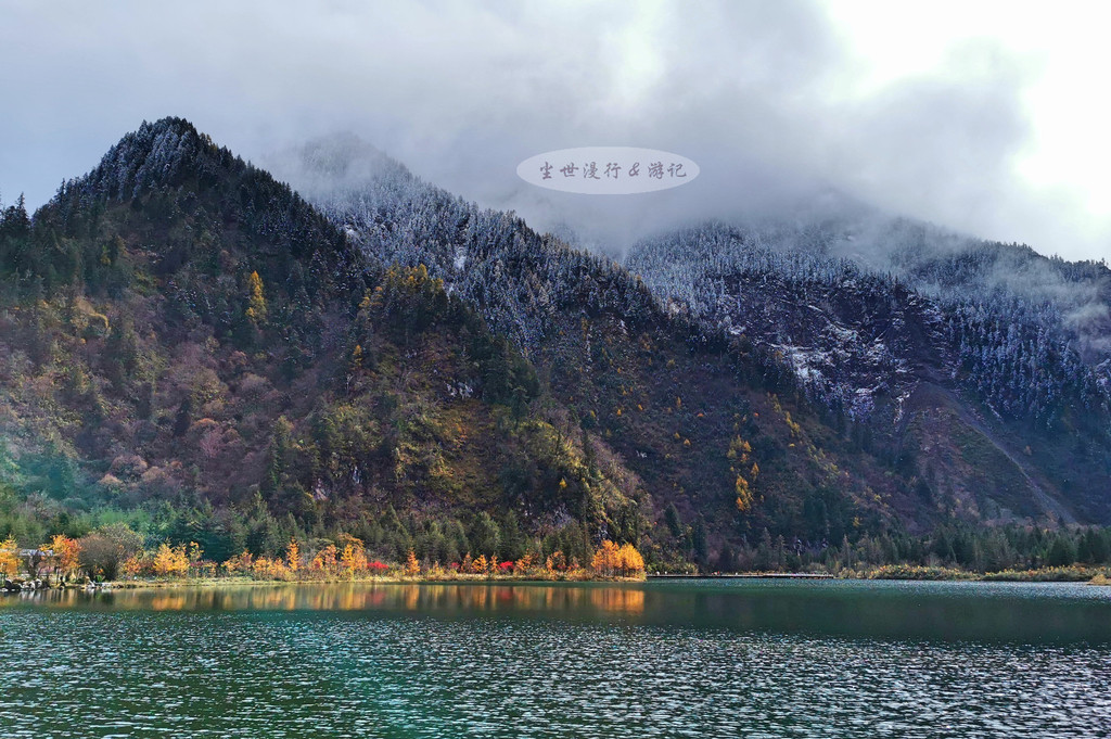微风吹过湖面,竟留下一条“镜面”,那橙色红杉、大红枫叶整齐地把身影印在了幽绿的湖面上。