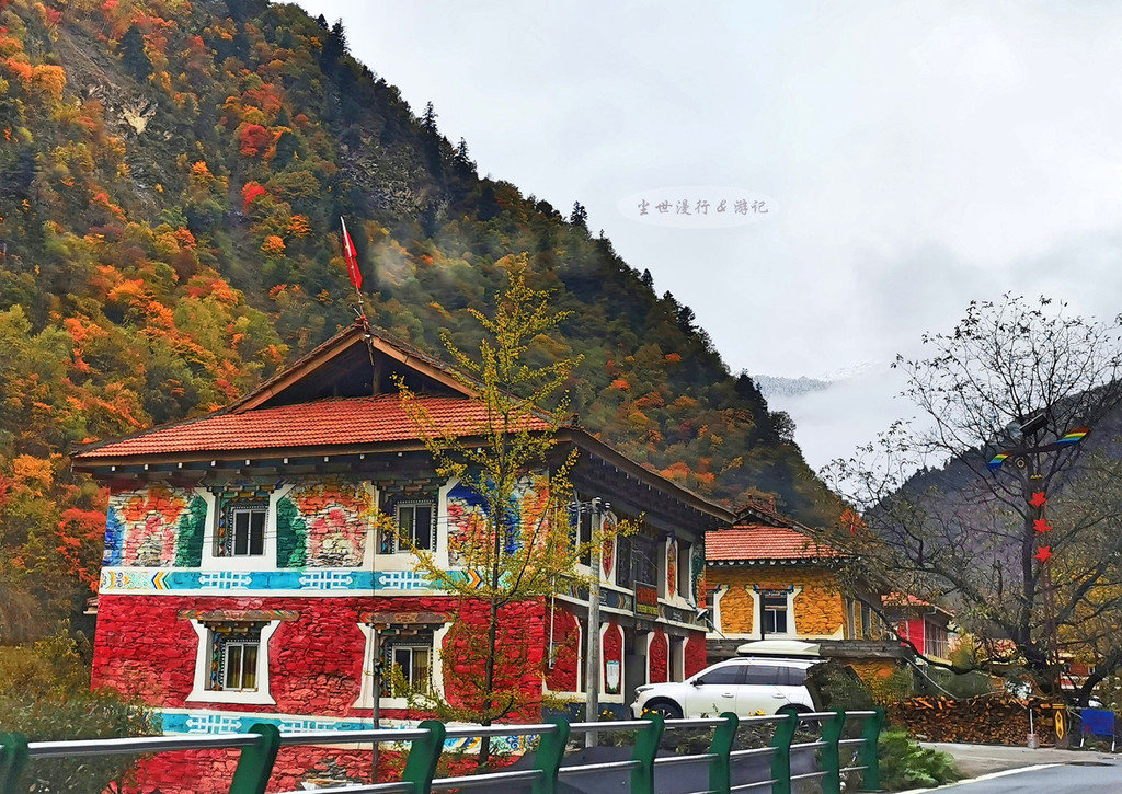 “七彩甲足”藏寨很小,就建在347国道旁。藏居因地制宜,用满山遍野的条石加上黄泥筑成。这些石头房子不仅坚实牢固,悬山式屋顶还铺上了红色瓦片,屋顶的正脊和屋檐上配以藏族风情的装饰,房屋外墙被刷得五颜六色,与色彩斑斓的彩林遥相呼应,远远望去宛如一幅水彩画。