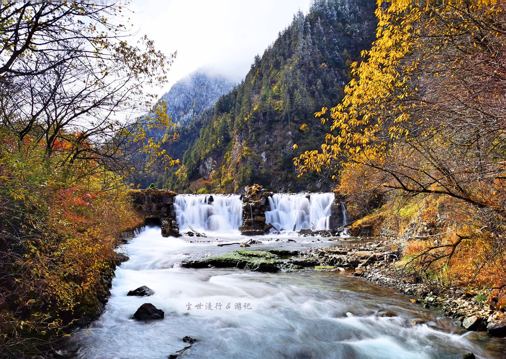 游步道旁哗哗水声,那是“龙王海瀑布”。拐个弯,两道洁白的瀑布掩映在彩林中。